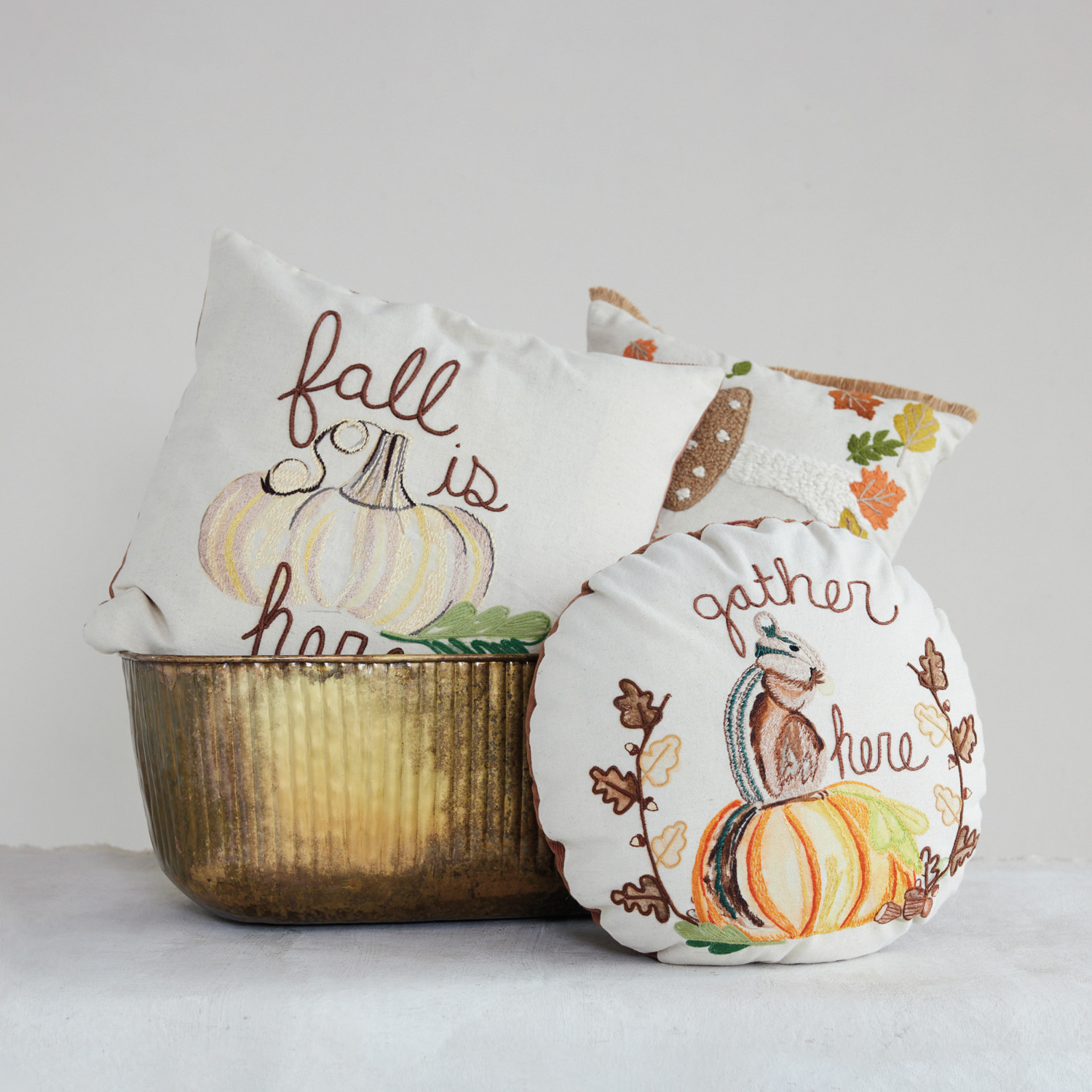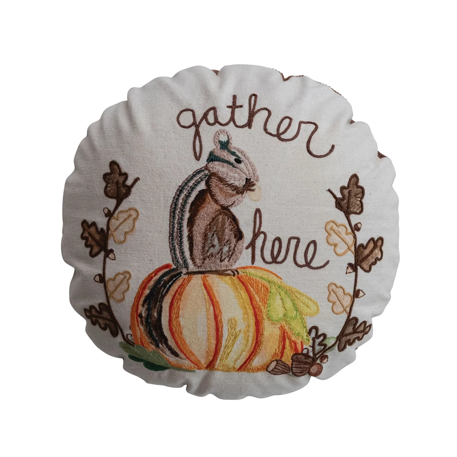 Catalog Name: 16" Round Cotton & Linen Printed Pillow w/ Squirrel, Pumpkin, Branches, Embroidery & Corduroy Back "Gather Here", Multi Color ©