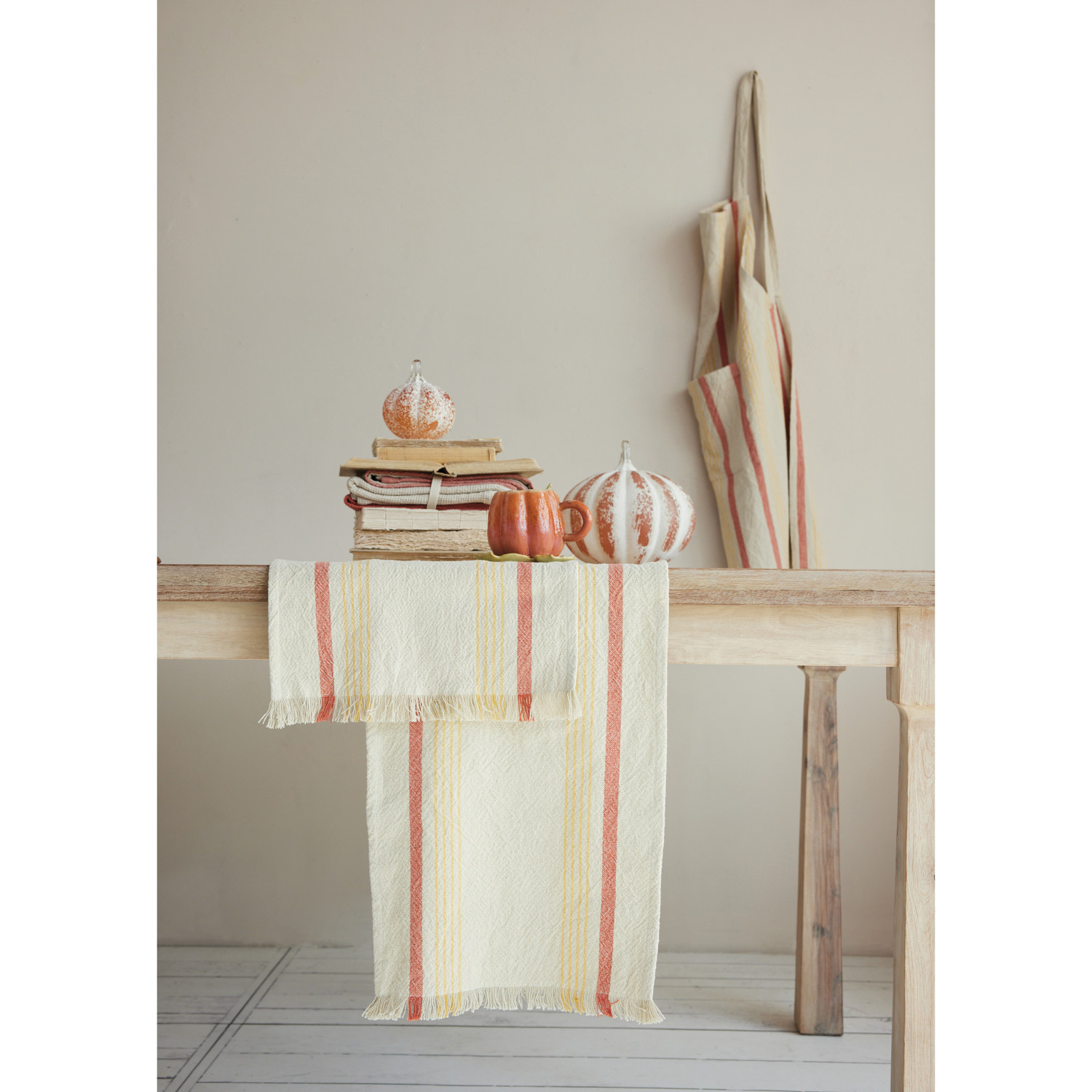 Catalog Name: 36"L x 14"W Woven Cotton Table Runner w/ Stripes & Eyelash Fringe, Natural, Yellow & Red, Roll Tied w/ Jute Cord