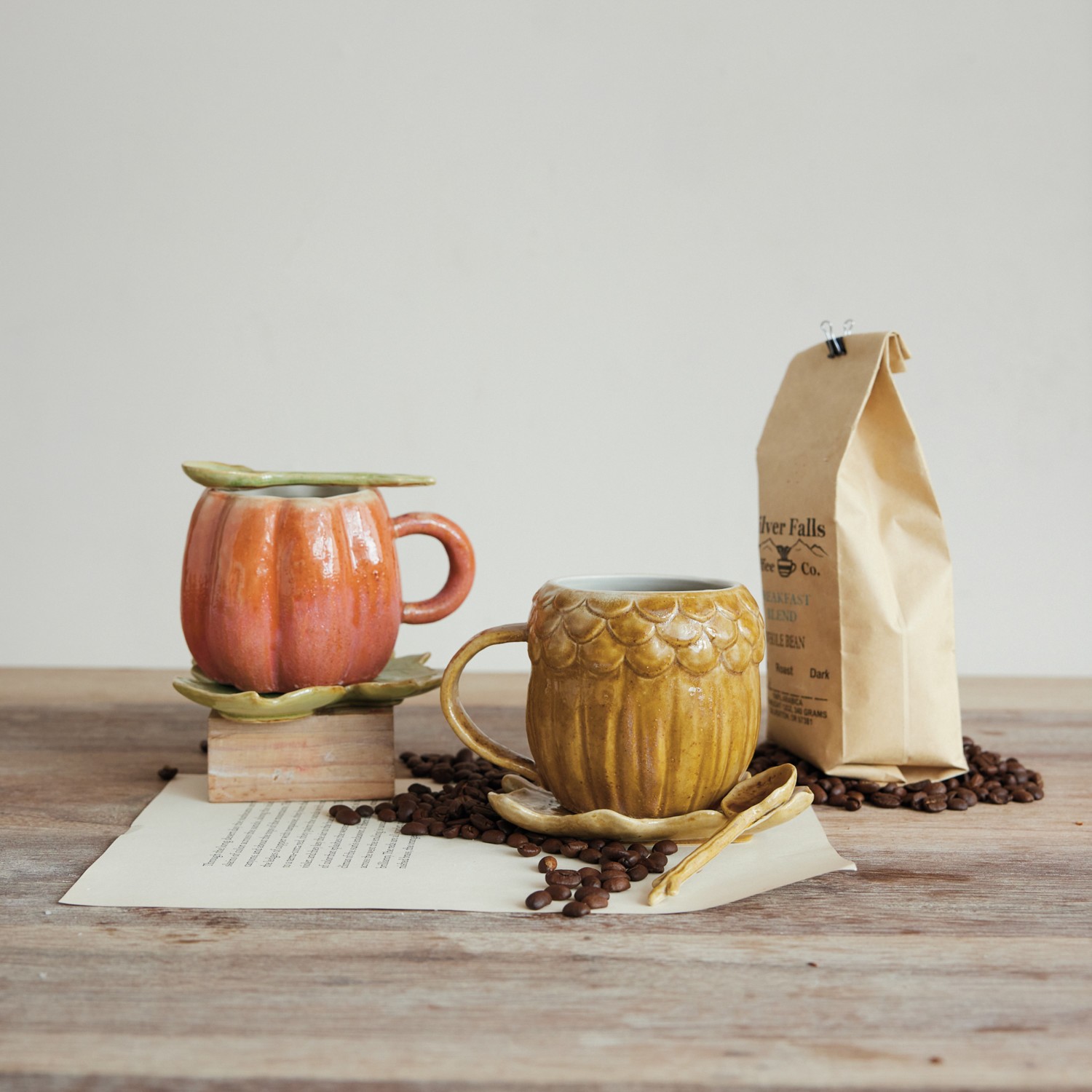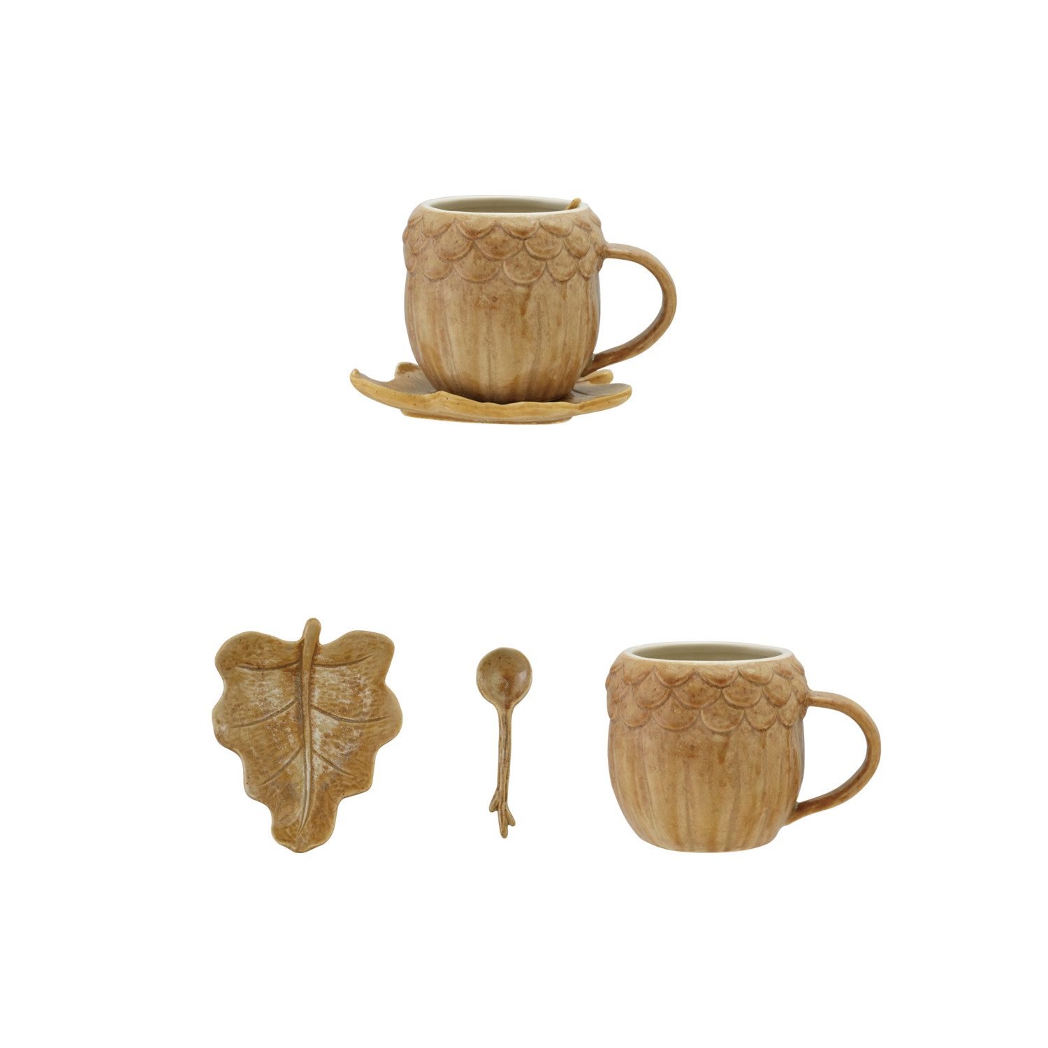 14 oz. Stoneware Acorn Shaped Mug with Saucer & Spoon, Set of 3 (Each One Will Vary)