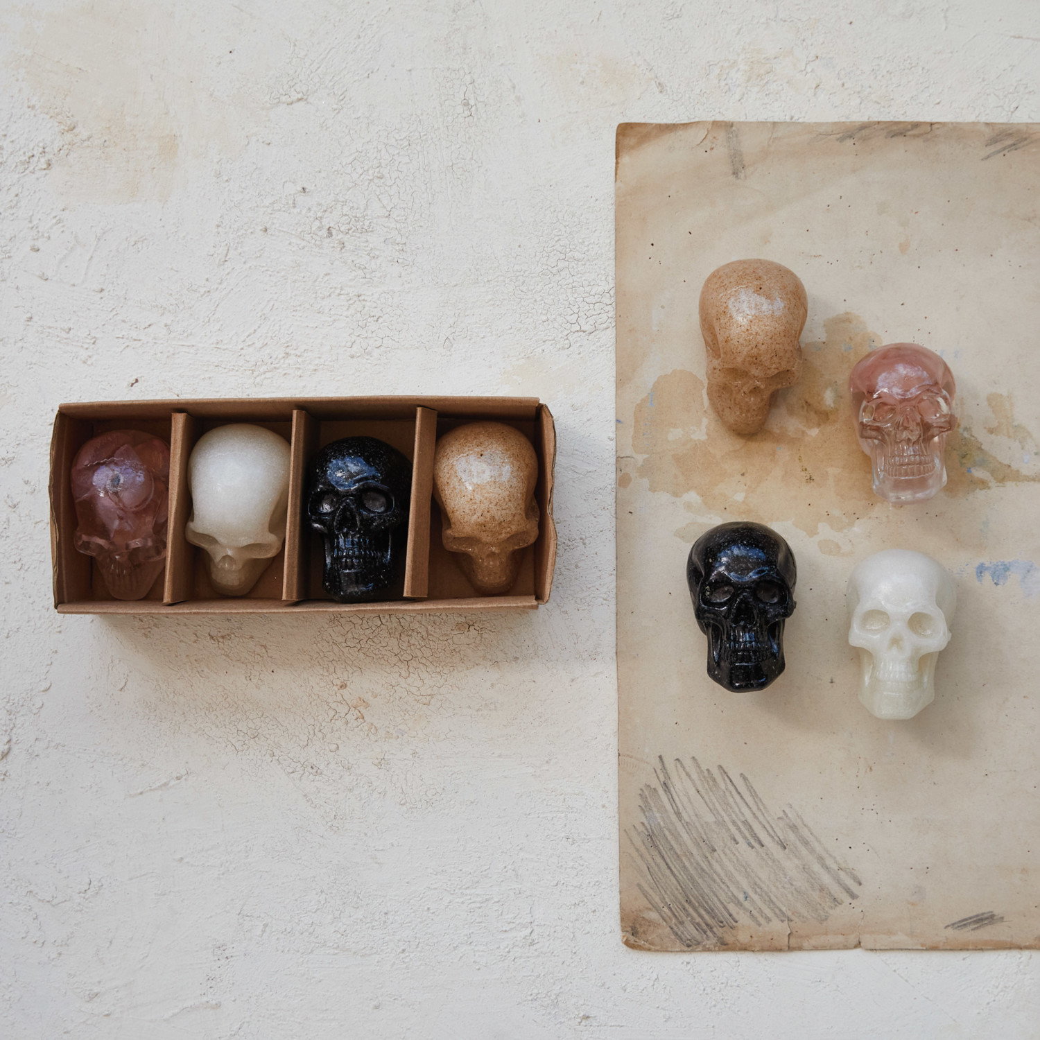 Catalog Name: 3-1/4"L x 2-1/4"W x 2-3/4"H Resin Skulls, Multi Color, Boxed Set of 4
