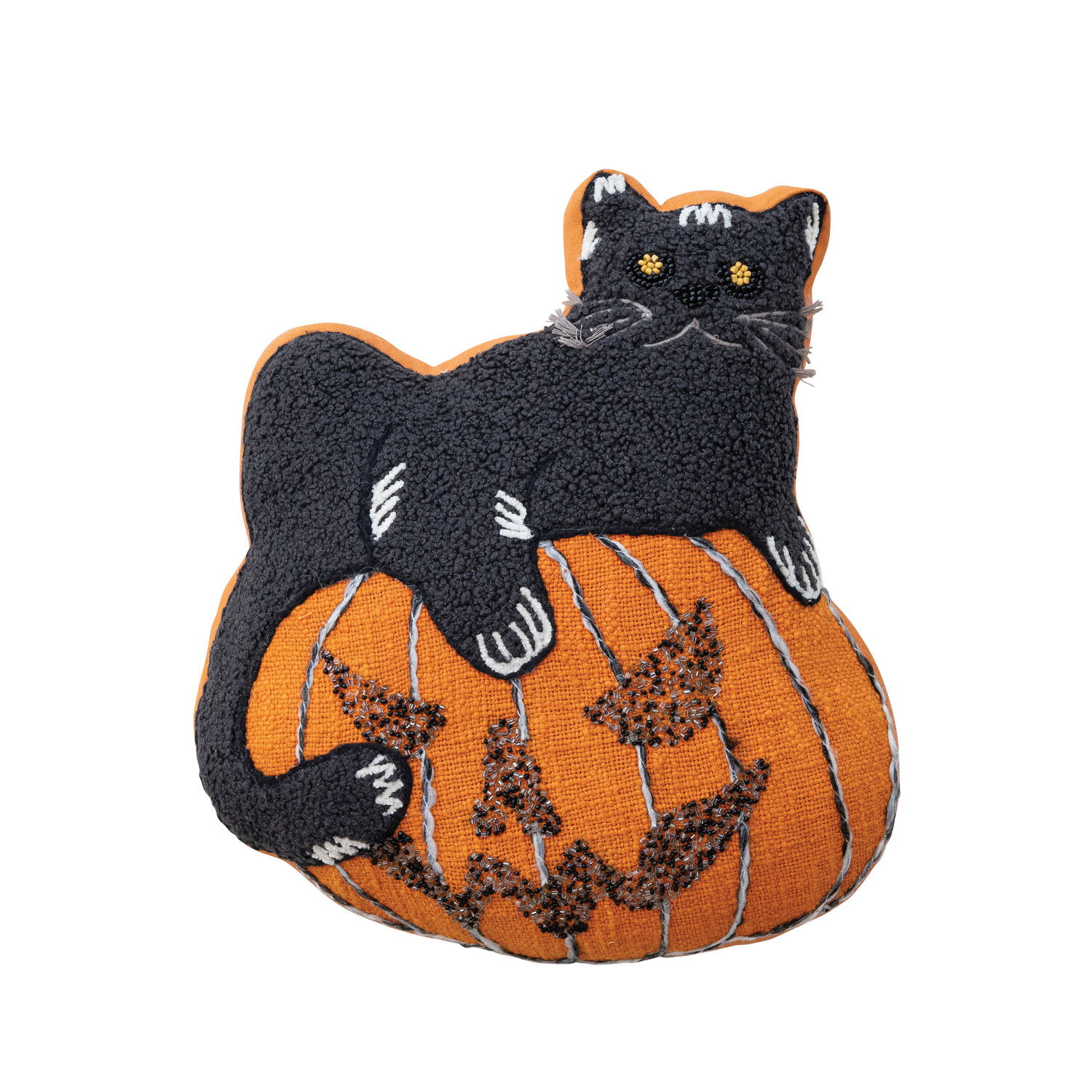 Catalog Name: 12"L x 13"H Cotton Slub Printed Black Cat on Jack-O-Lantern Shaped Pillow w/ Embroidery & Beads, Multi Color