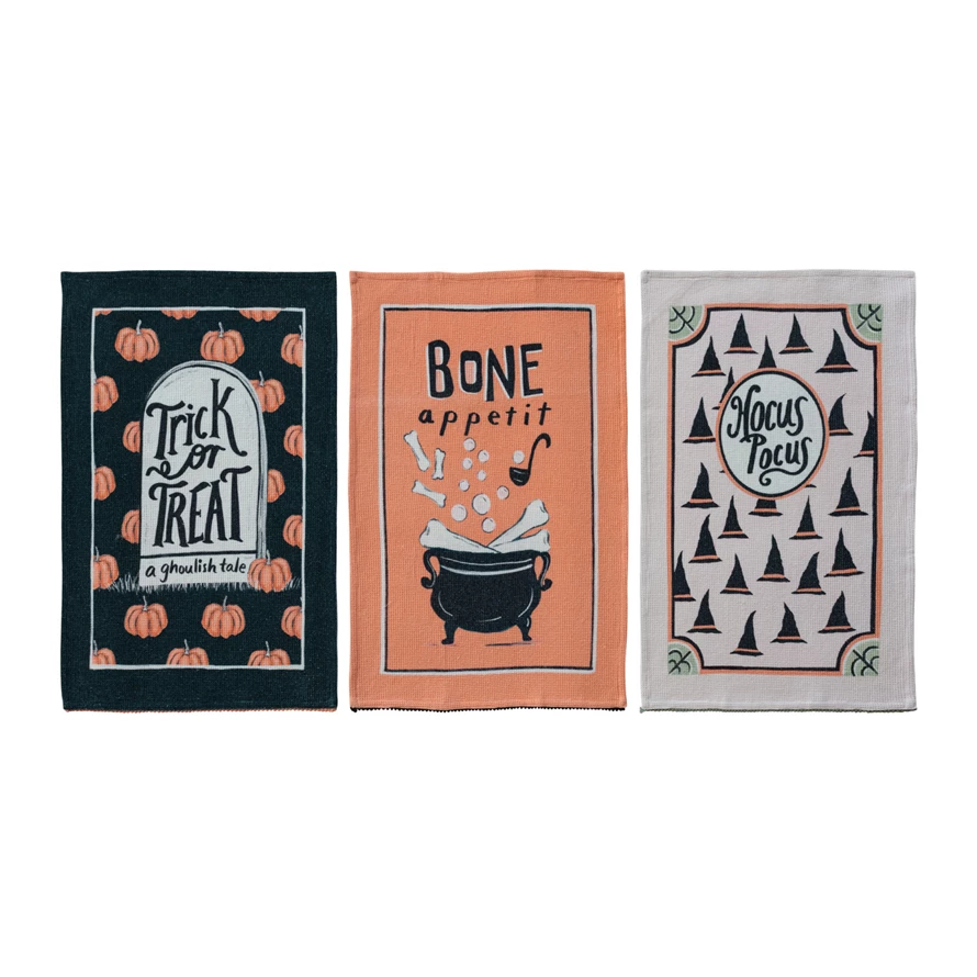Cotton Waffle Weave Printed Tea Towel with Halloween Saying & Pom Pom Trim, 3 Styles ©