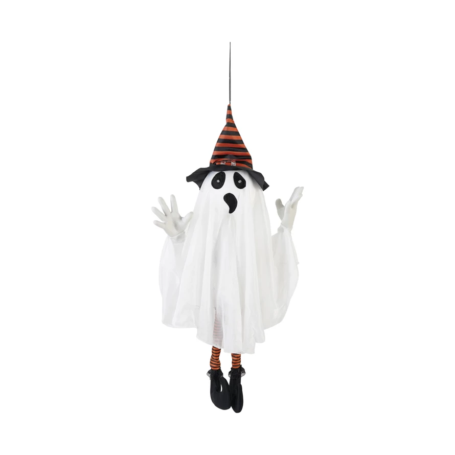 Catalog Name: 22"L x 4"W x 26-3/4"H Hanging Fabric Animated Ghost in Witch Hat w/ Lights, Sound & Try Me Button, White, Black & Orange Color (Batteries Included)