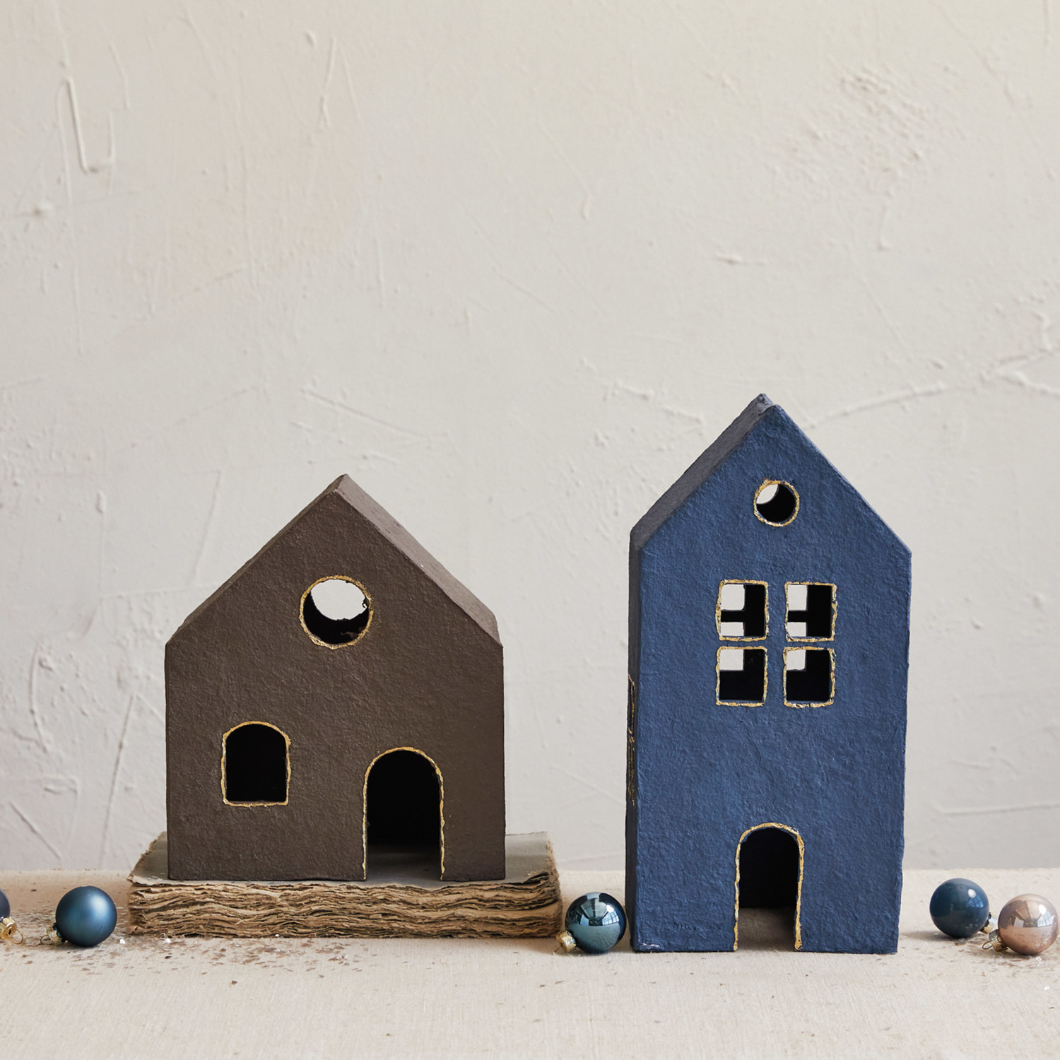 Hand-Painted Paper Mache House, Blue & Gold Color