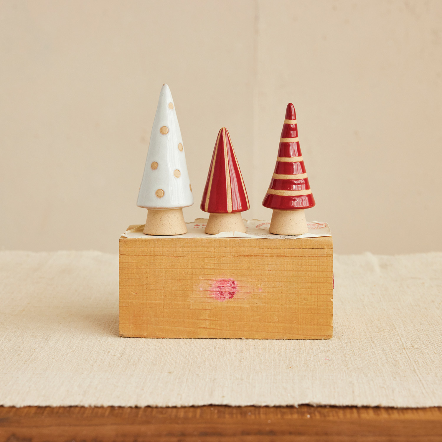 Stoneware Trees with Patterns, Red, White & Unglazed, Set of 3
