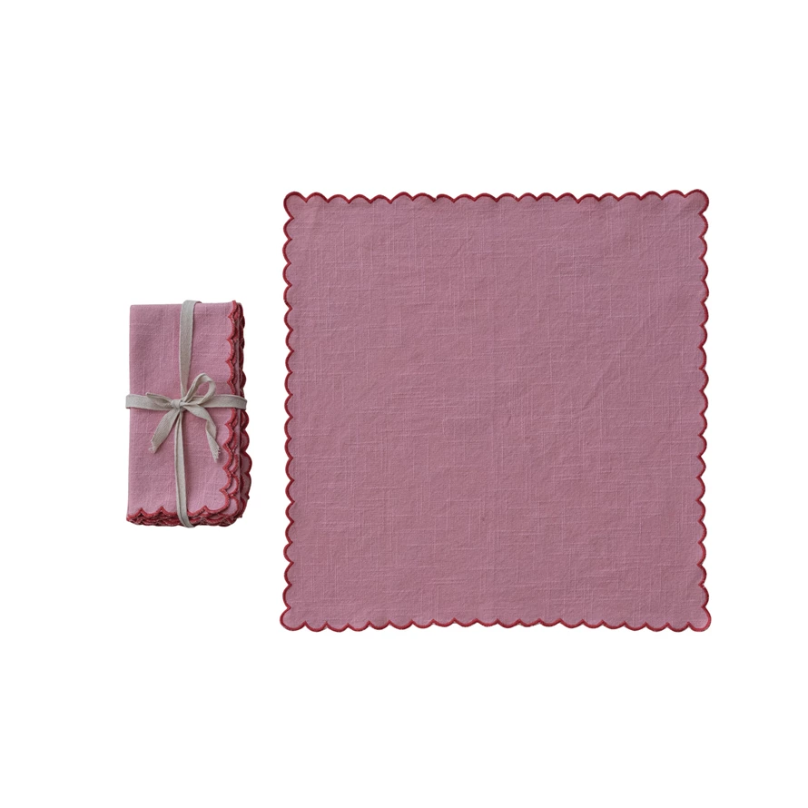 Catalog Name: 18" Square Cotton Scalloped Napkins w/ Contrasting Stitched Edges, Pink & Red, Set of 4 Tied w/ Cotton Tape