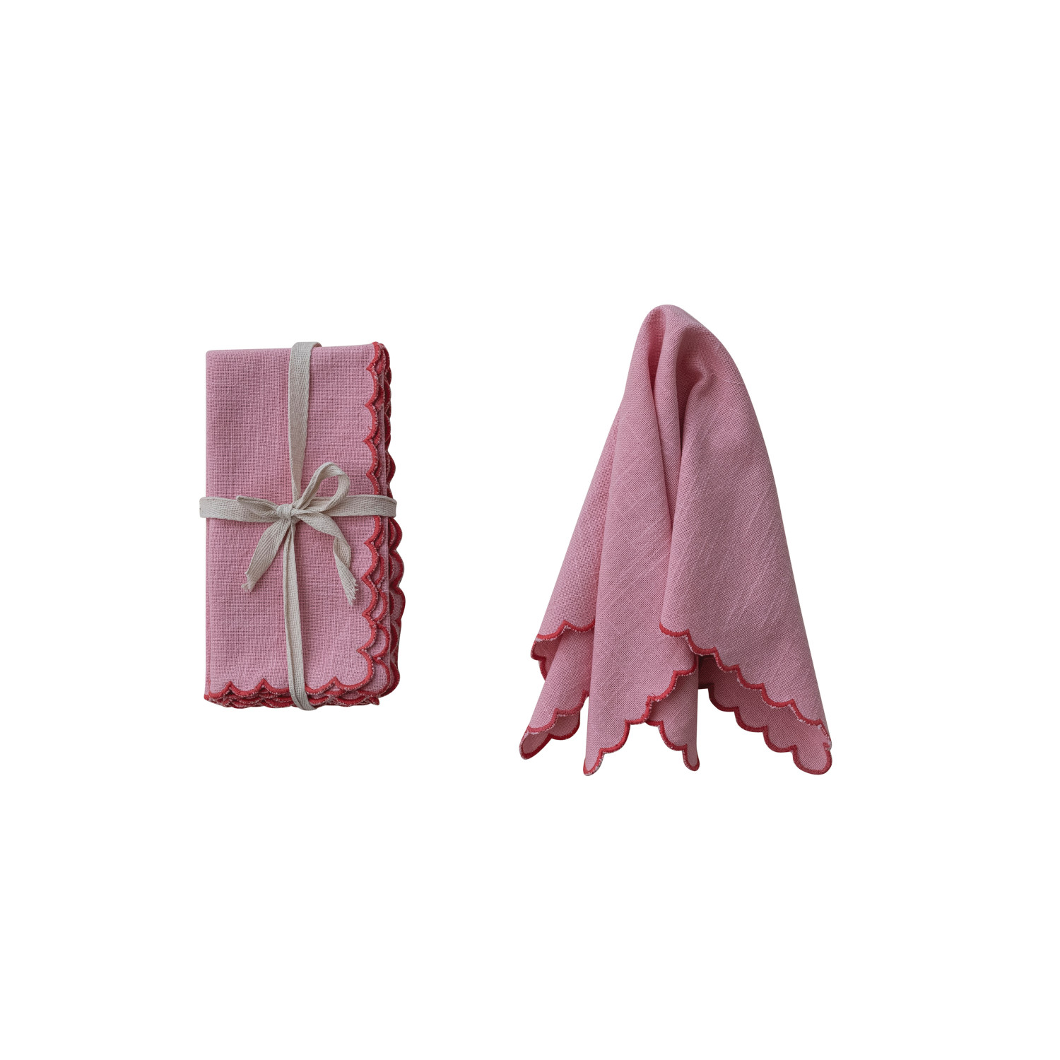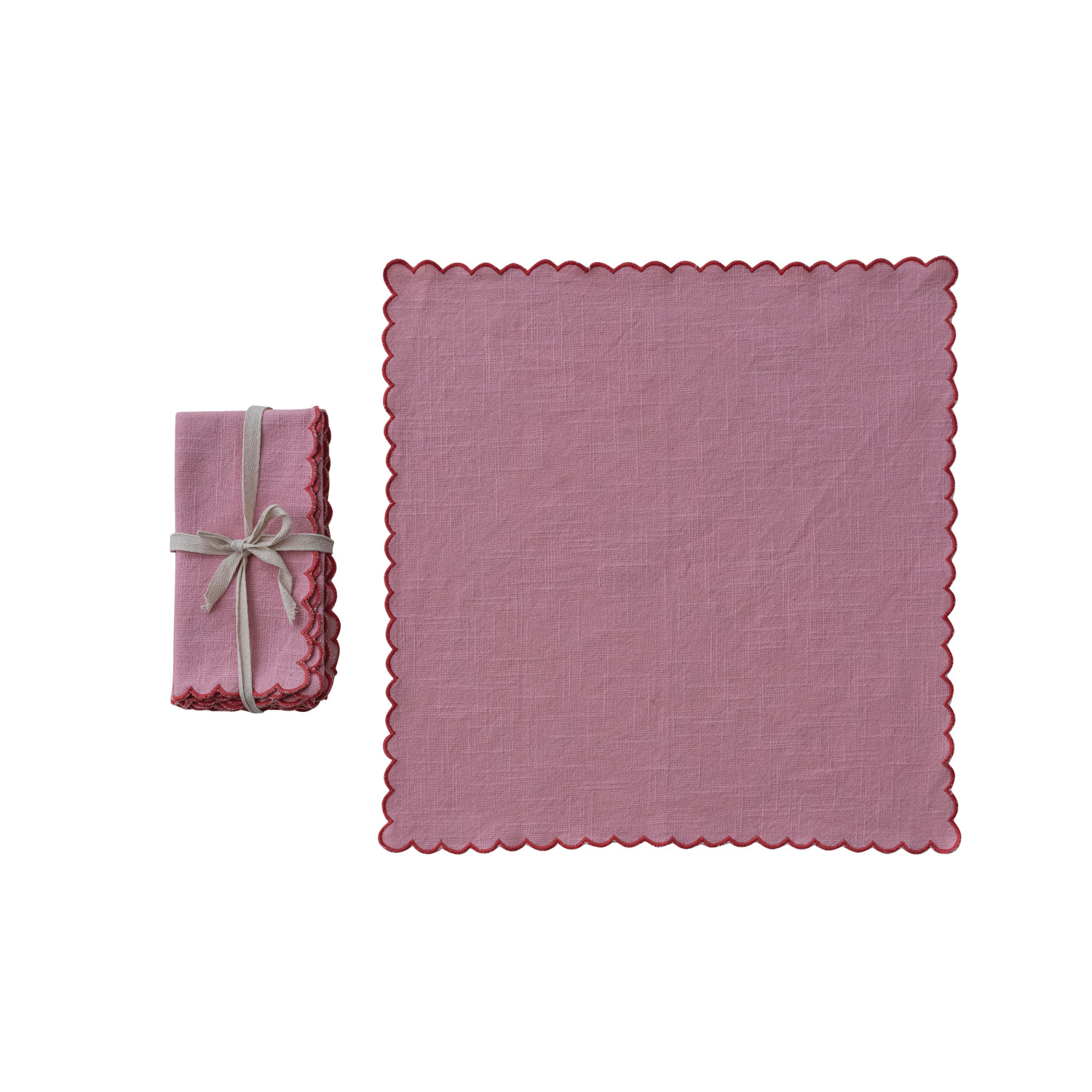 Catalog Name: 18" Square Cotton Scalloped Napkins w/ Contrasting Stitched Edges, Pink & Red, Set of 4 Tied w/ Cotton Tape