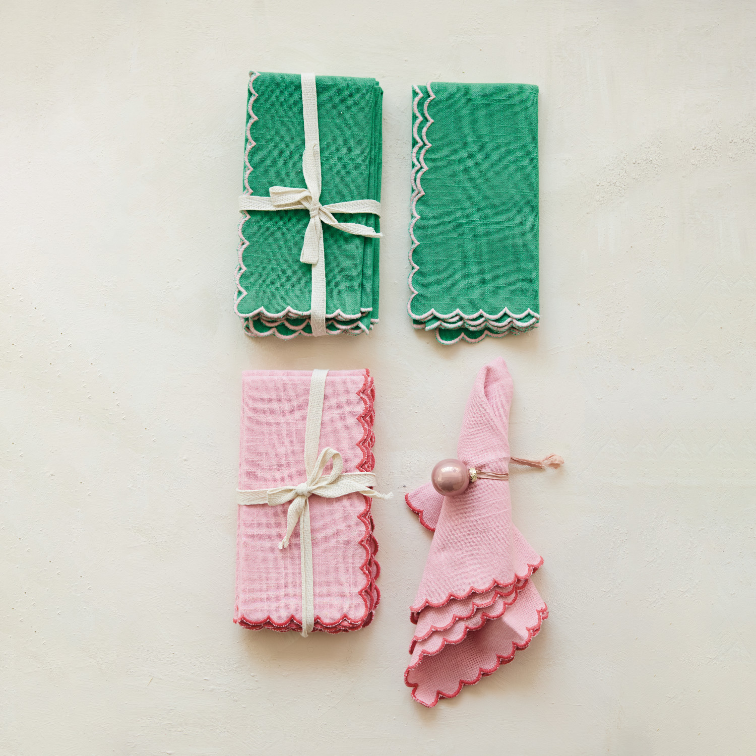 Cotton Scalloped Napkins with Contrasting Stitched Edges, Set of 4 Tied with Cotton Tape
