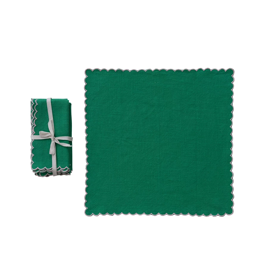 Cotton Scalloped Napkins with Contrasting Stitched Edges, Set of 4 Tied with Cotton Tape