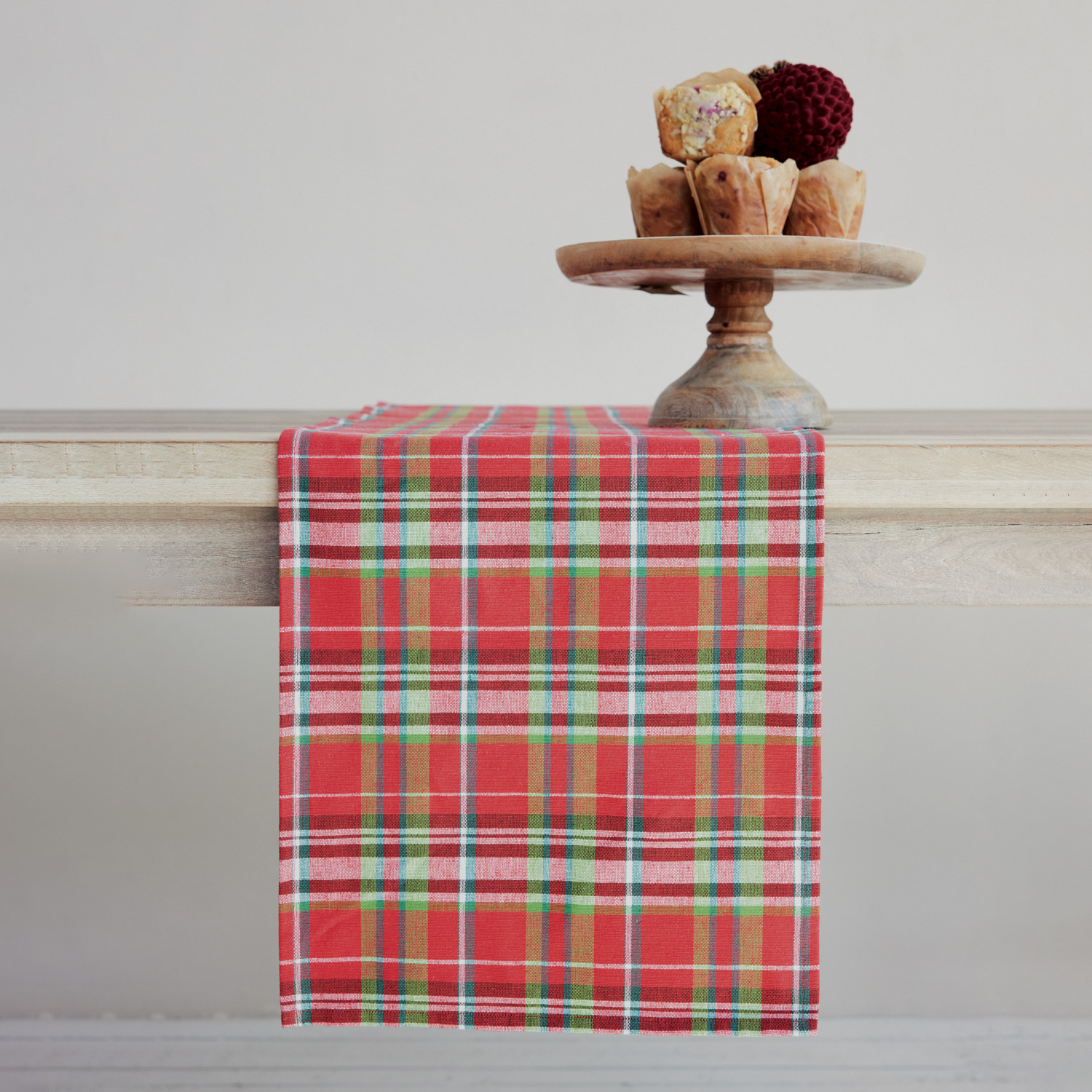 Catalog Name: 72"L x 14"W Woven Cotton Table Runner w/ Tartan Plaid Pattern, Multi Color, Roll Tied w/ Green Cotton Tape