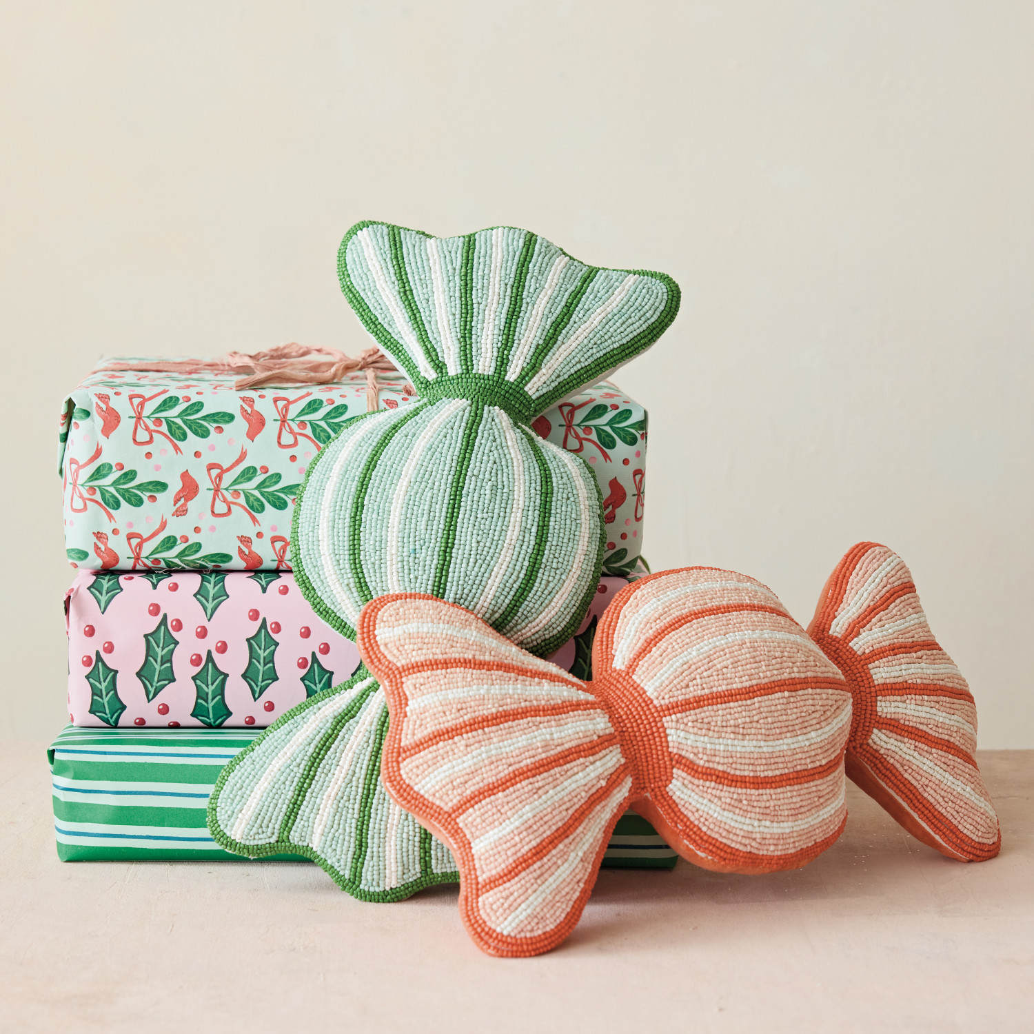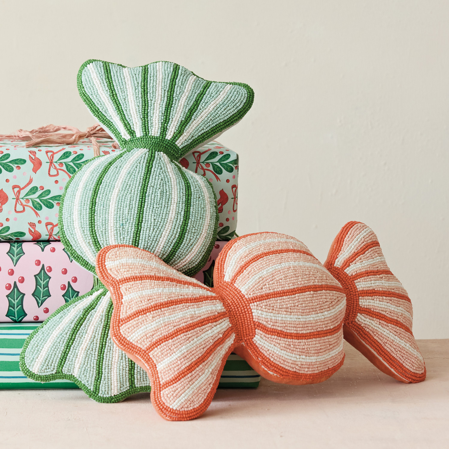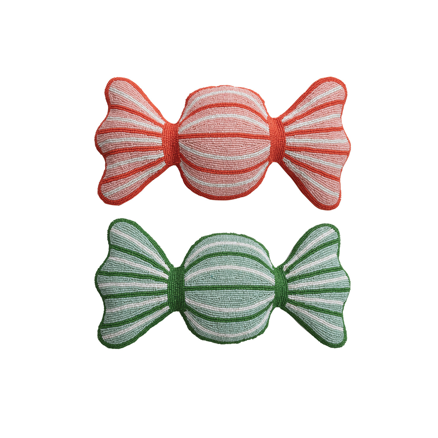 Glass Beaded Fabric Candy Shaped Pillow with Cotton Velvet Back, 2 Colors