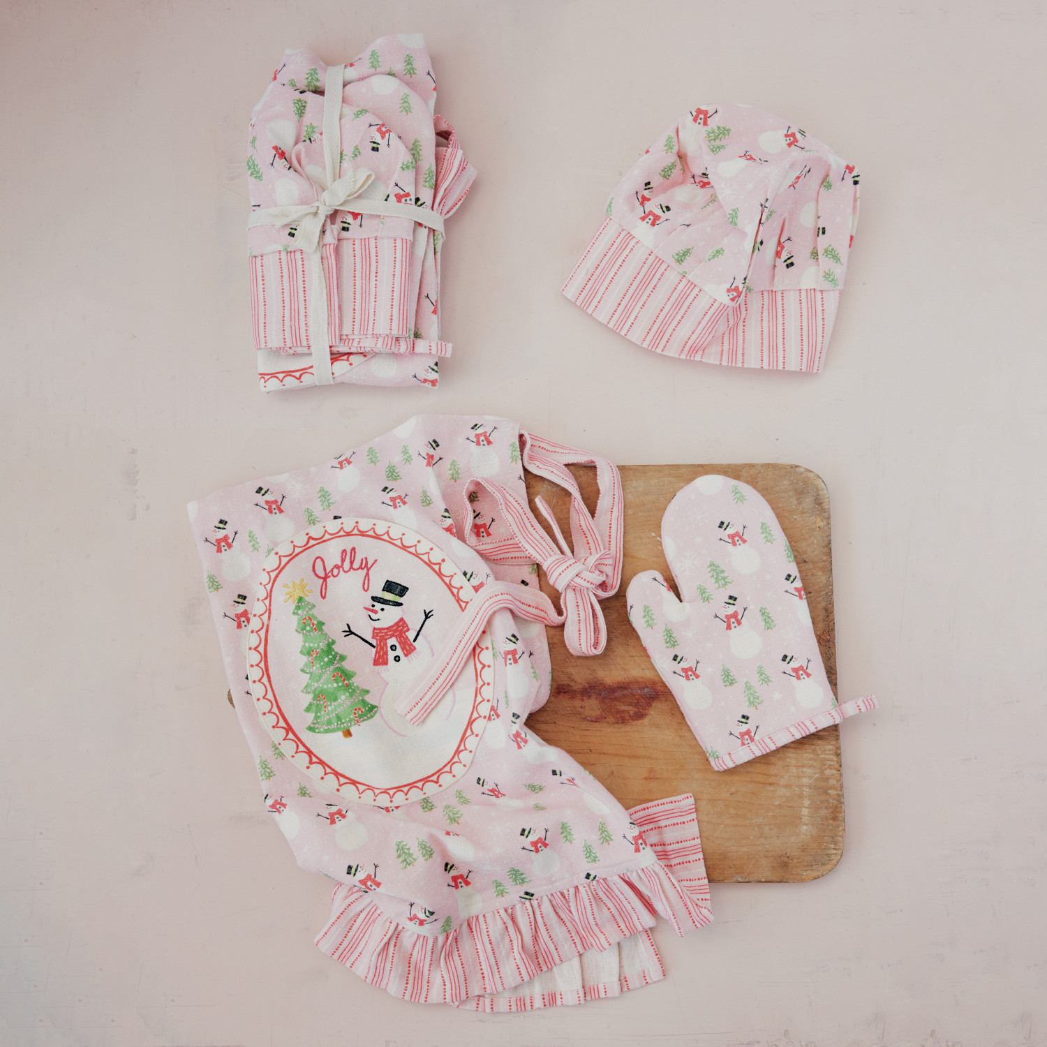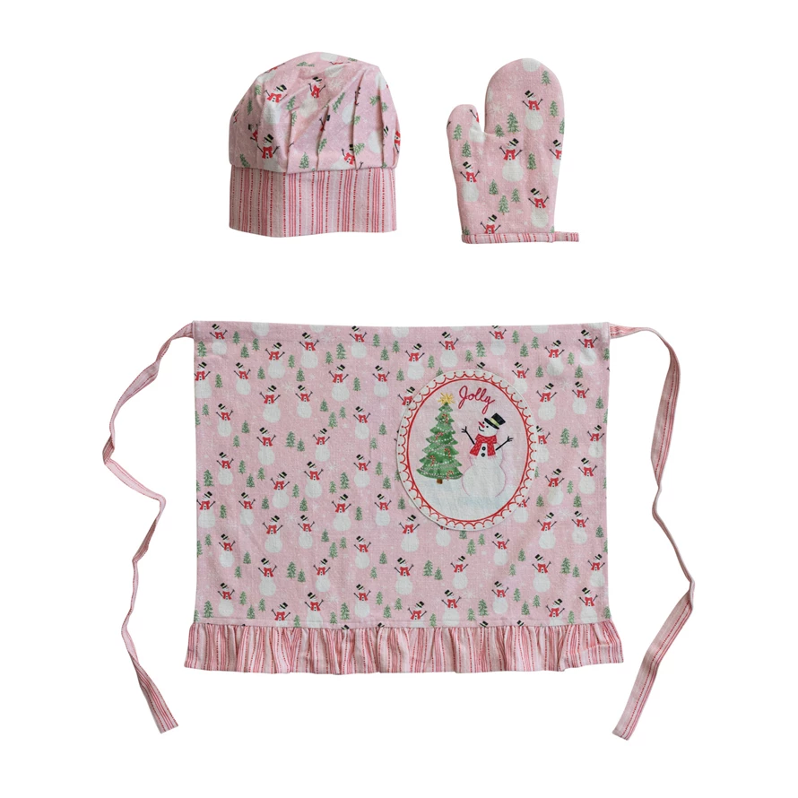 Catalog Name: 24"L x 20"W Cotton Printed Child Apron w/ Pocket, Ruffle, Snowman Pattern, Snowman, Tree, Embroidery, Chef Hat & Hot Mitt "Jolly", Multi Color, Set of 3 Tied w/ Cotton Tape ©