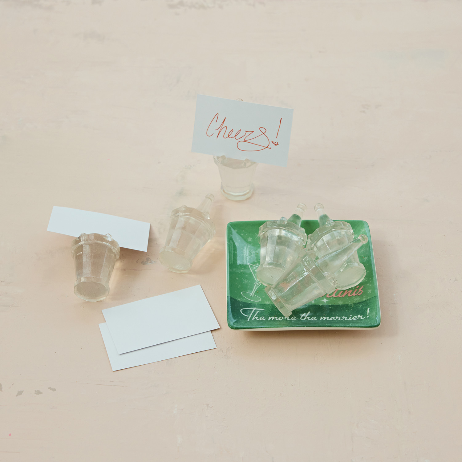 Catalog Name: 1-3/4" Round x 4"H Clear Resin Champagne Bottle in Bucket Shaped Place Card/Photo Holders w/ 12 Paper Cards, Boxed Set of 6