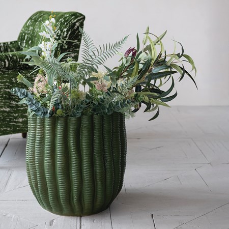 Catalog Name: 3-1/2" Round x 4-3/4"H 14 oz. Stoneware Ribbed Mug, Reactive Glaze, Red (Each One Will Vary)