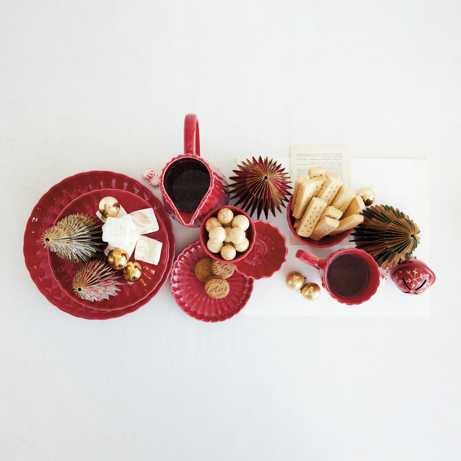 10 oz. Stoneware Ribbed Mug with Saucer, Red, Set of 2 (Each One Will Vary)