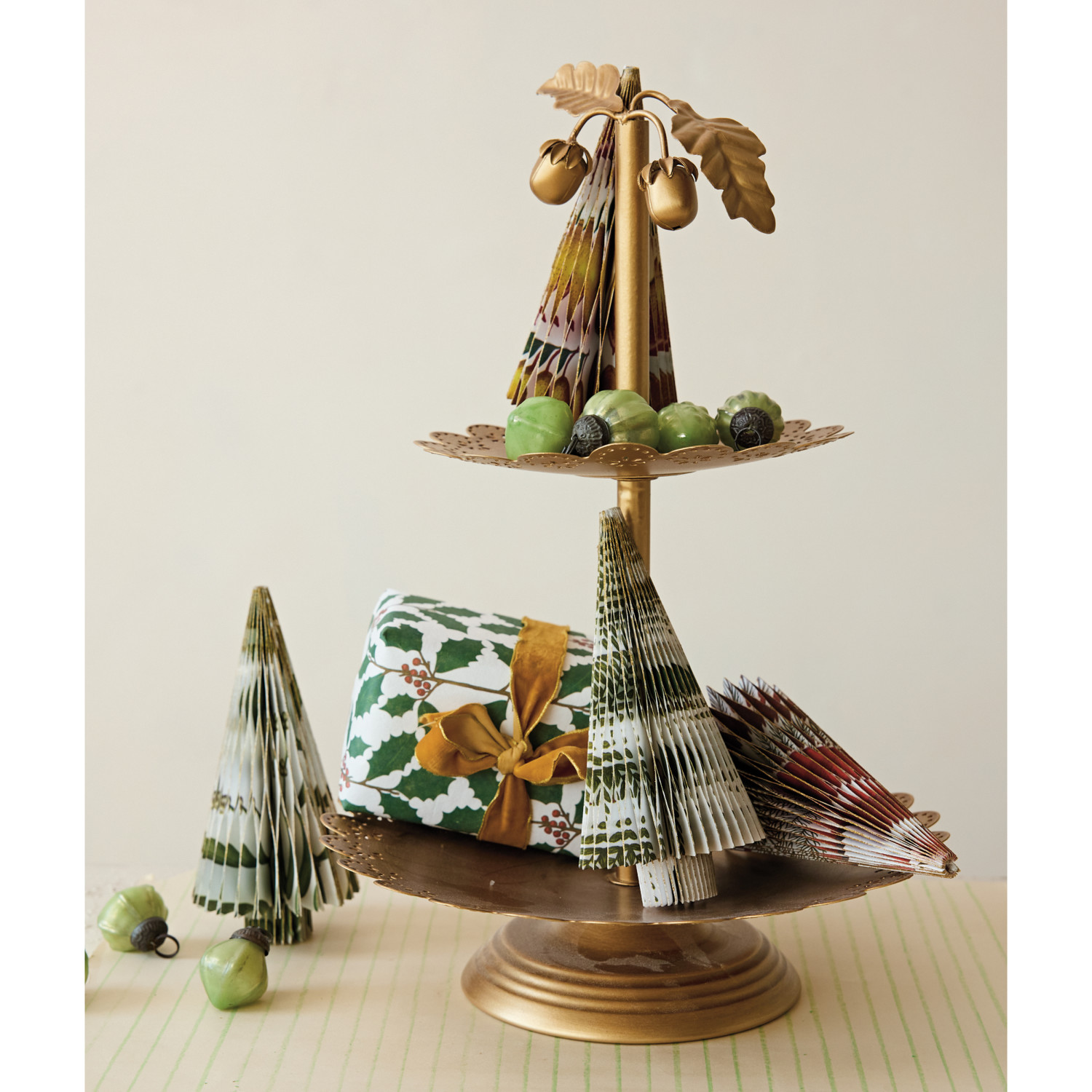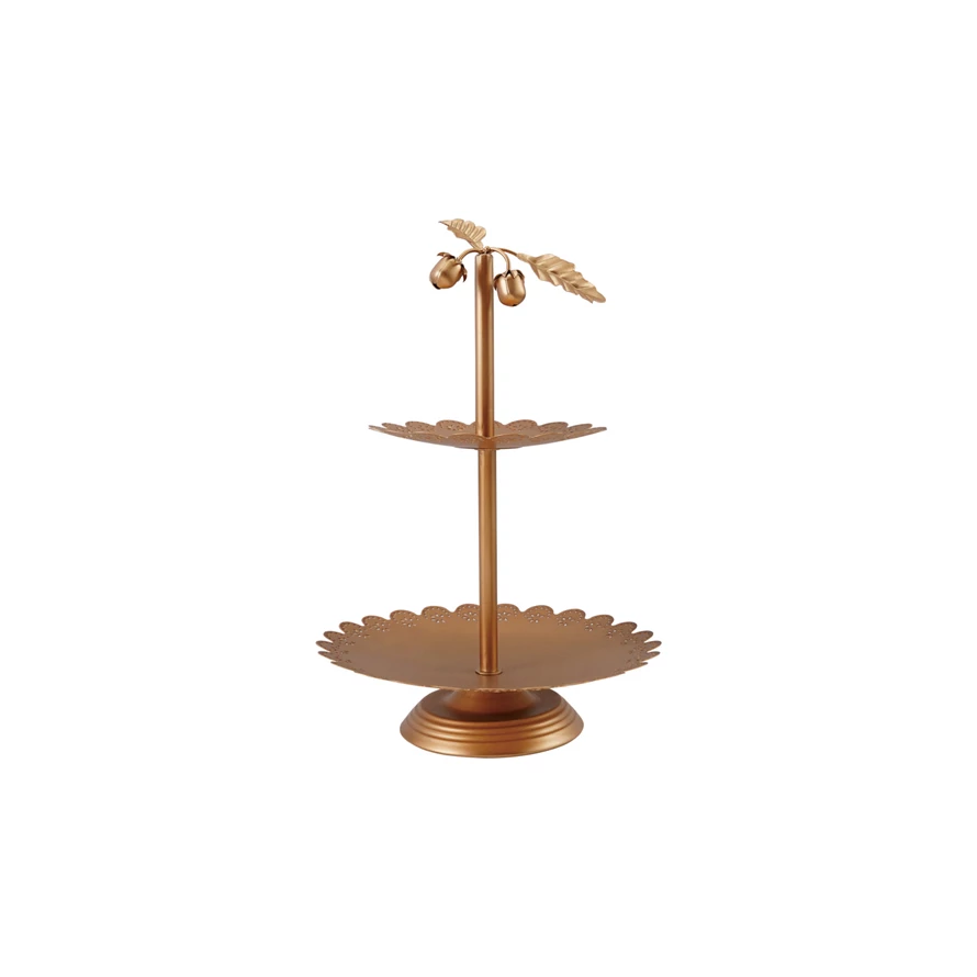 Decorative Metal Scalloped 2-Tier Tray with Acorns & Leaves, Gold Finish, KD