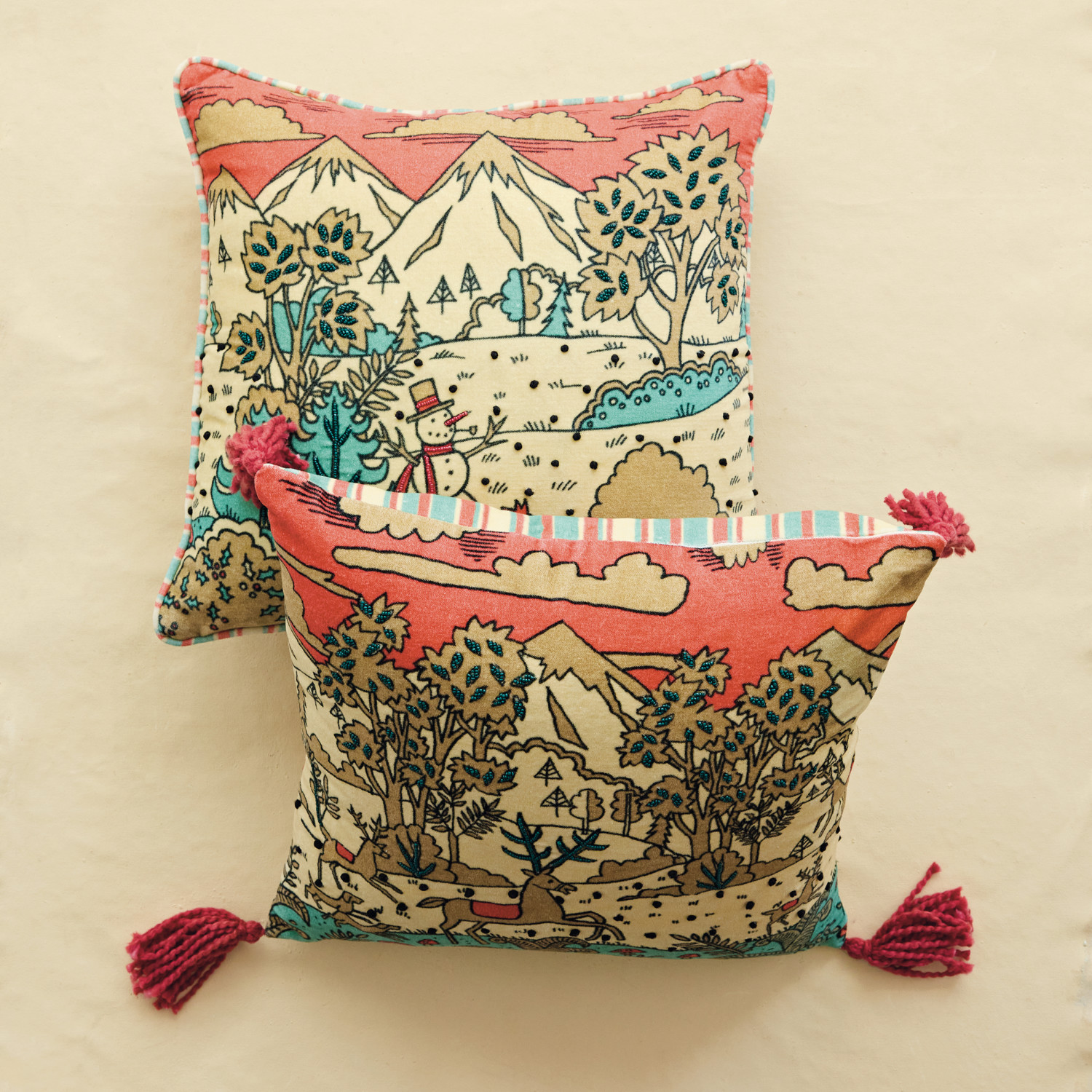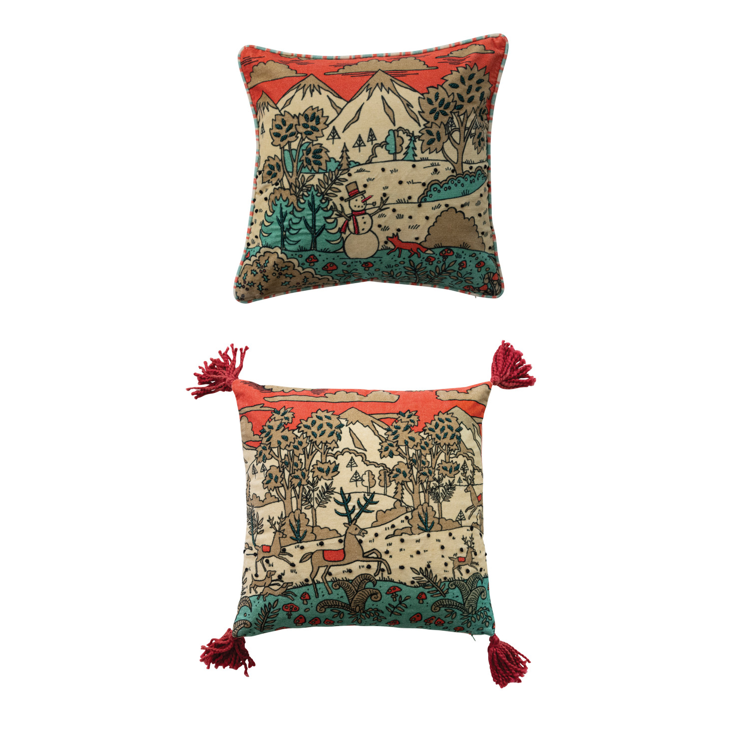 Catalog Name: 18" Square Cotton Velvet Pillow w/ Winter Scene, Reindeer, French Knots, Beads, Piping/Tassels & Striped Back, Multi Color, 2 Styles ©