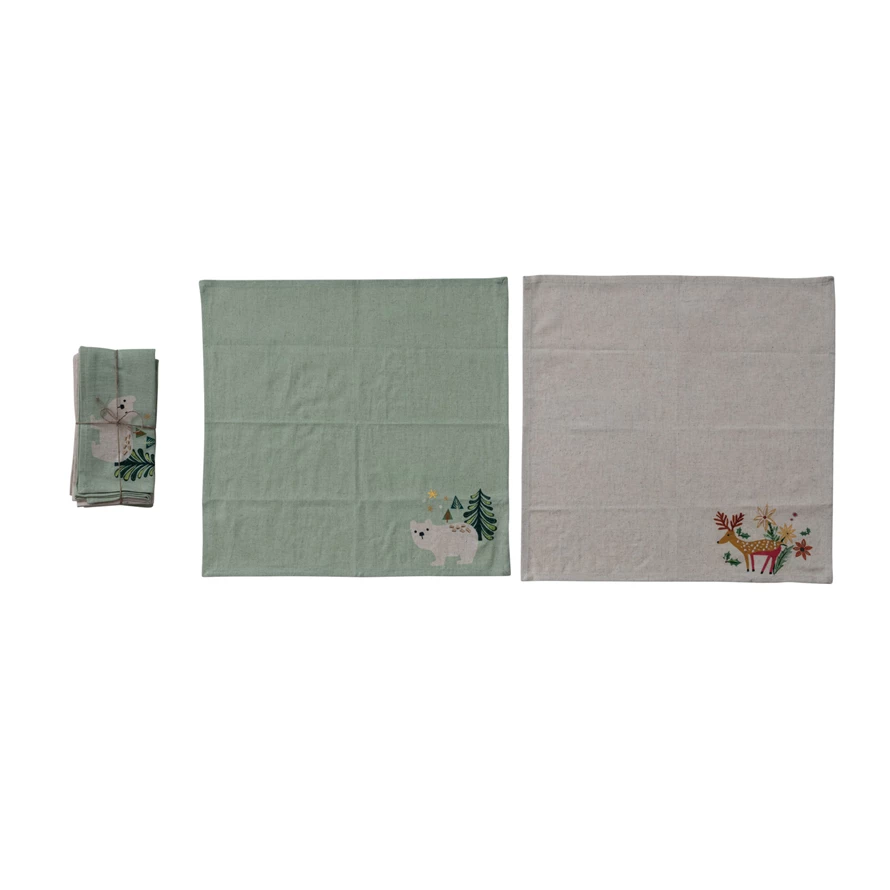 Cotton & Linen Printed Napkins with Animal & Seasonal Botanicals, Set of 4 Tied with Jute ©