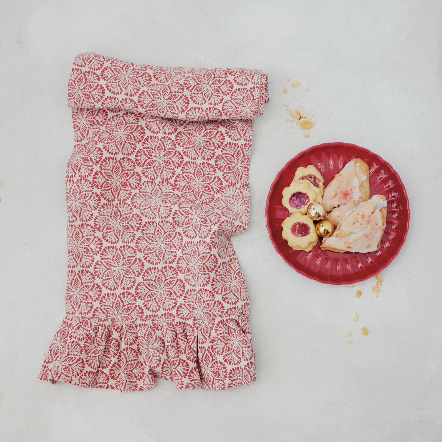 Fabric Blend Block Printed Table Runner with Pattern & Ruffle, Red & Natural