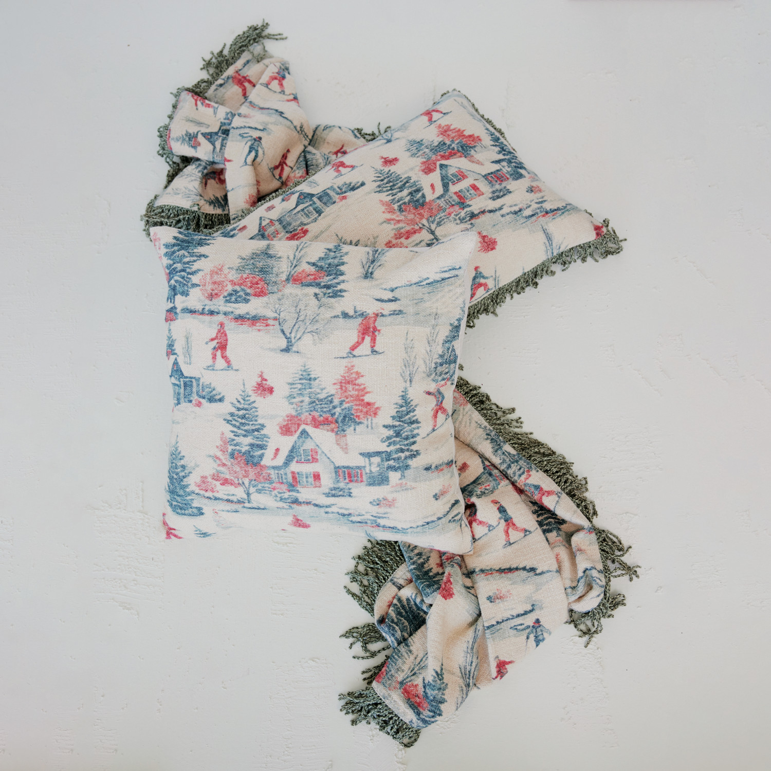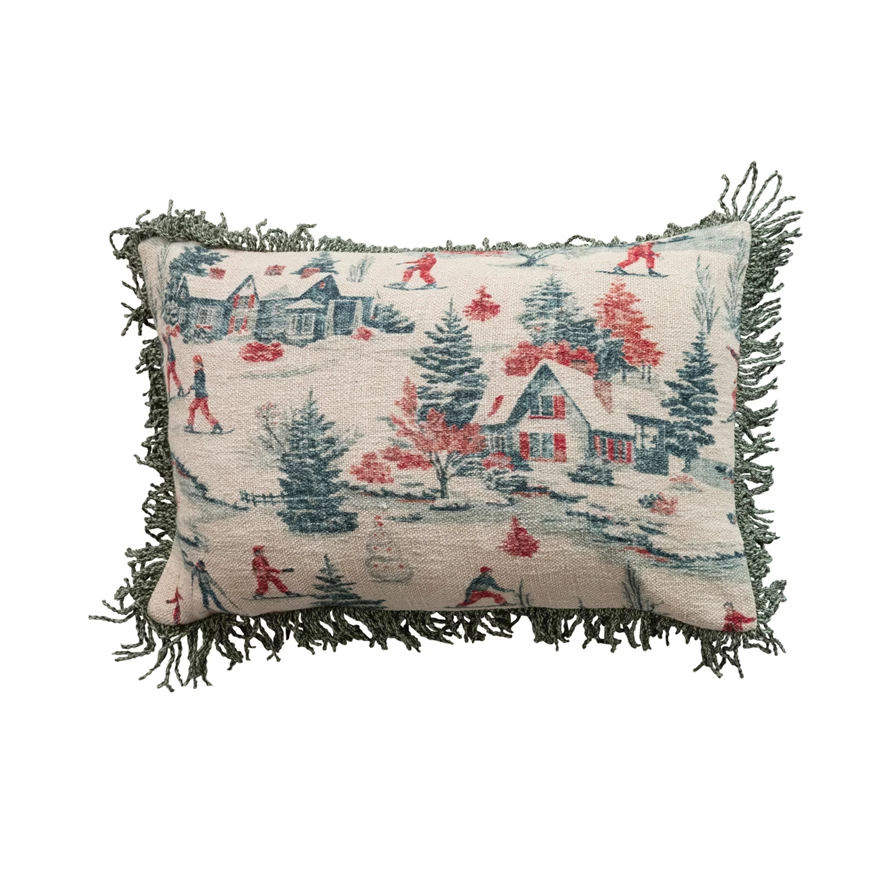Cotton Slub Printed Lumbar Pillow with Ski Scene & Bullion Fringe