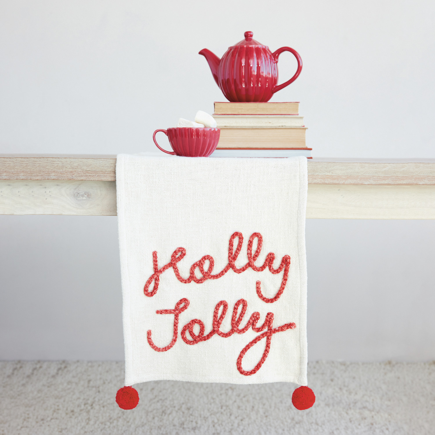 Cotton Slub Table Runner with Pom Poms & Embroidered "Holly Jolly"