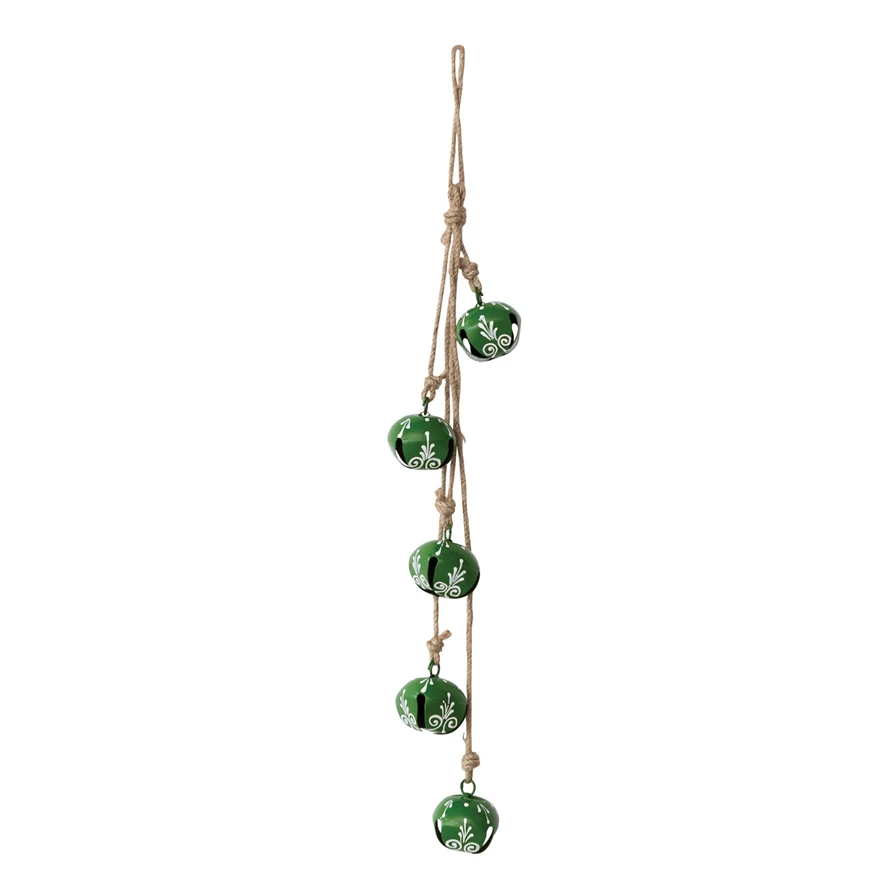 Catalog Name: 15-1/2"H Hanging Hand-Painted Metal Jingle Bell Cluster w/ Design & Jute Hanger, Green & White