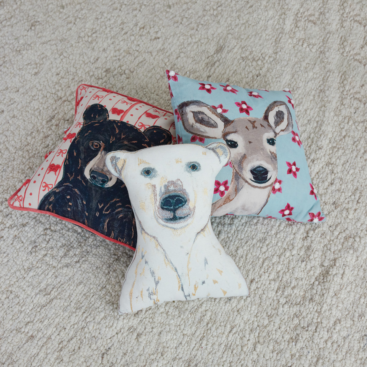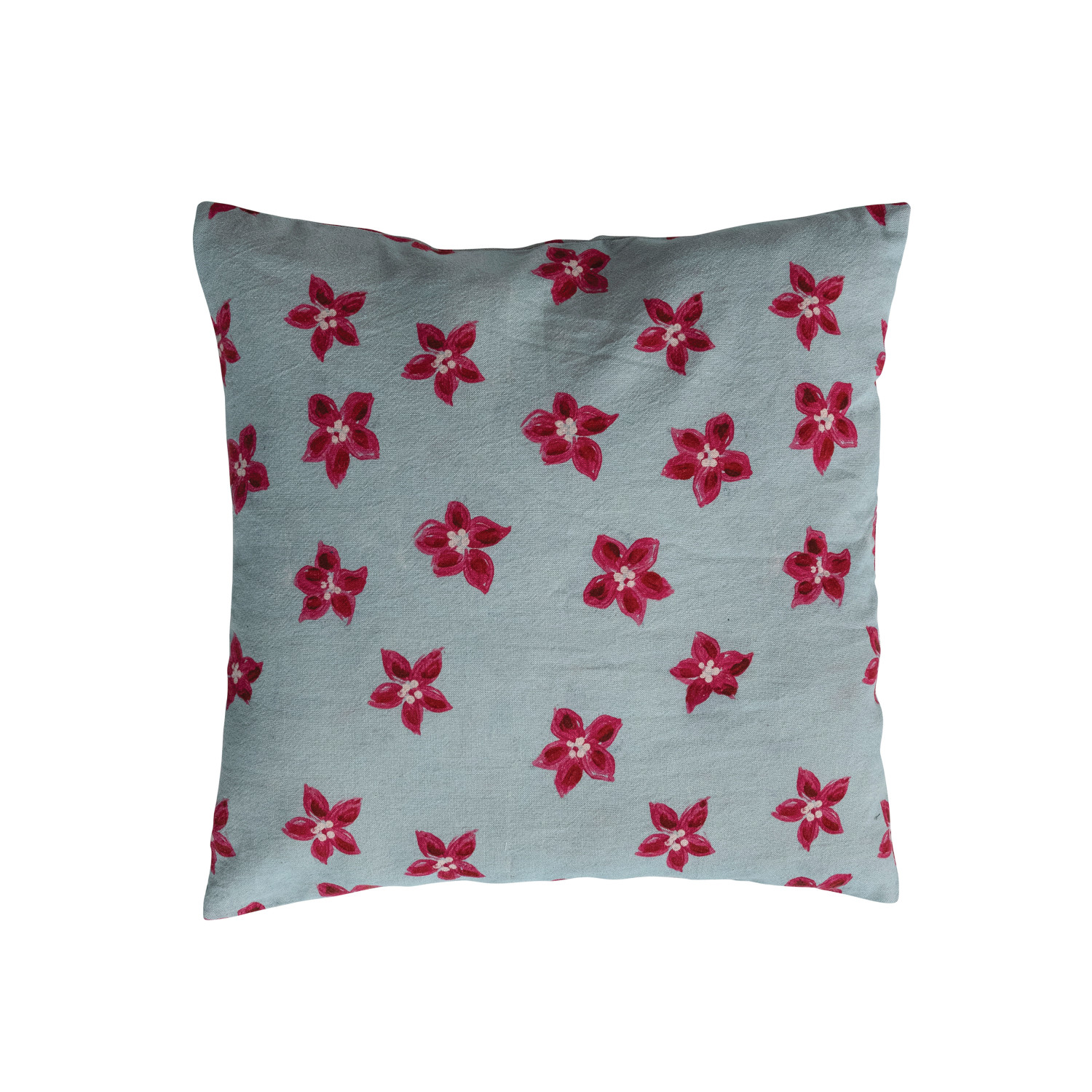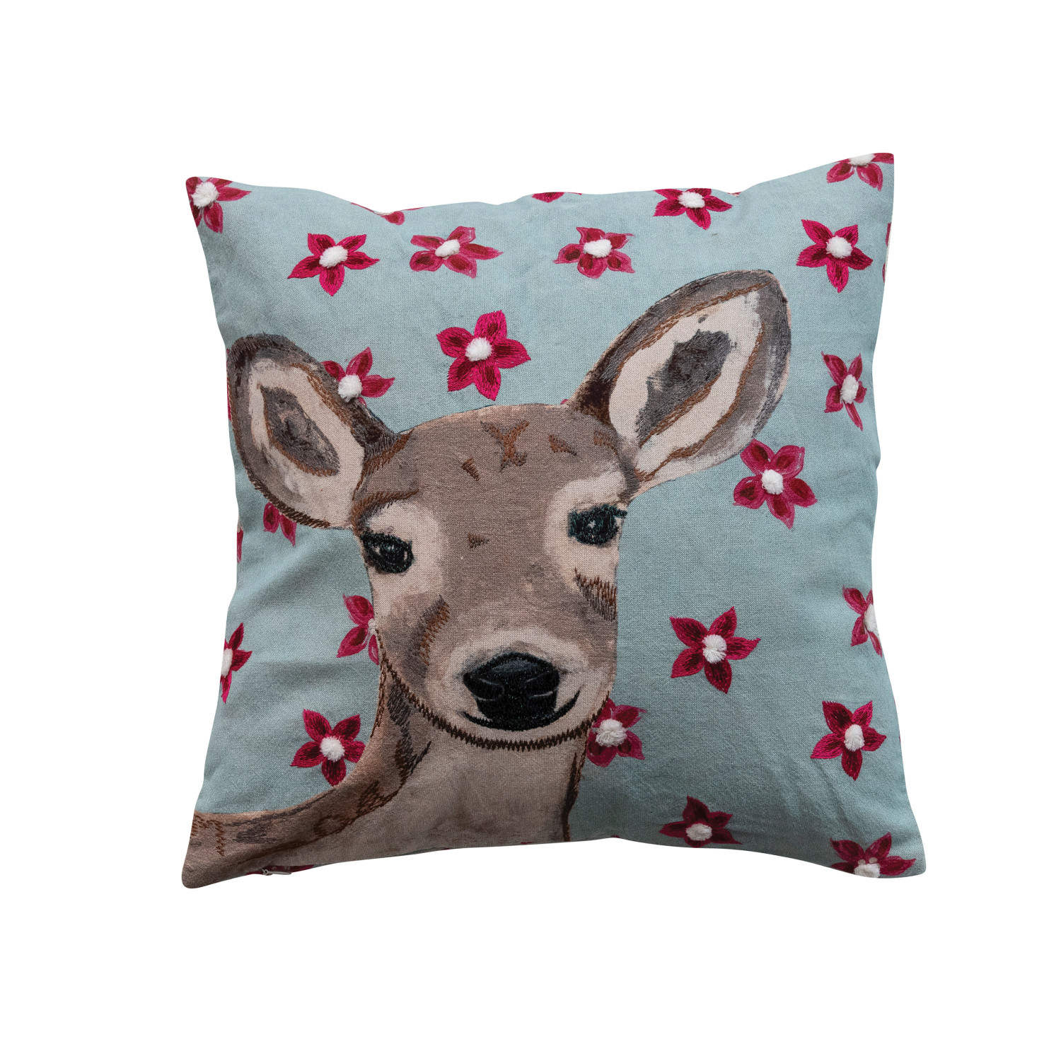 18" Square Cotton Printed Pillow with Holiday Pattern, Deer & Embroidery ©