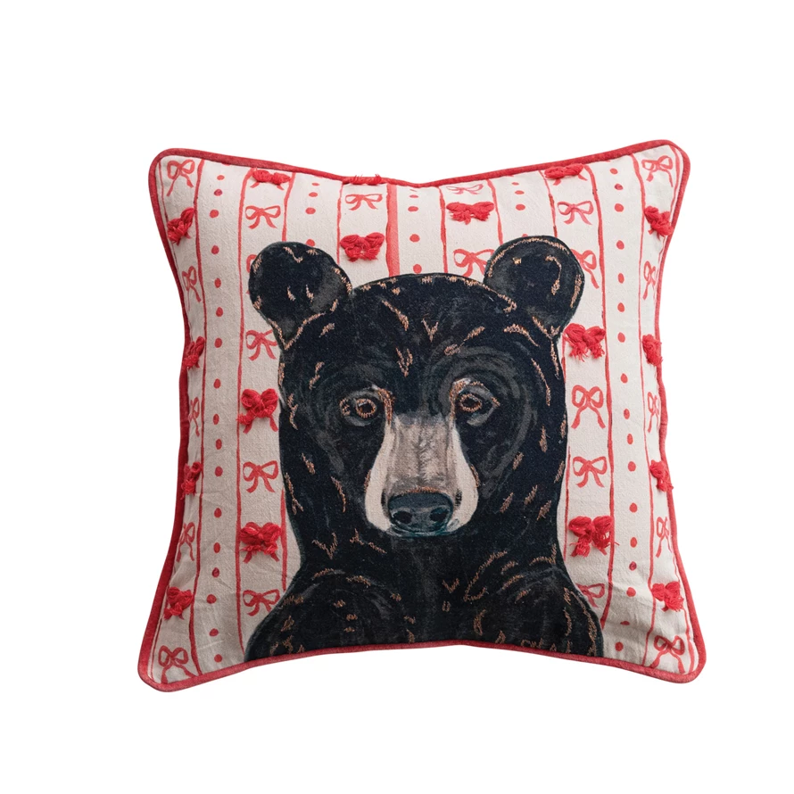 Catalog Name: 18" Square Cotton Chambray Printed Pillow w/ Holiday Pattern, Bear, Embroidery, Applique & Piping, Multi Color ©