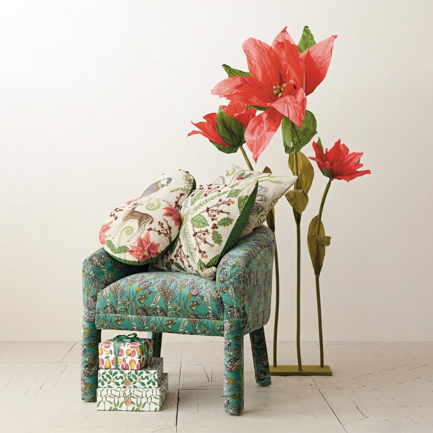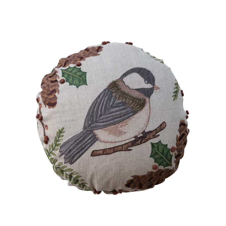 16" Round Linen Printed Pillow with Seasonal Botanicals, Bird, Embroidery & Cotton Back ©