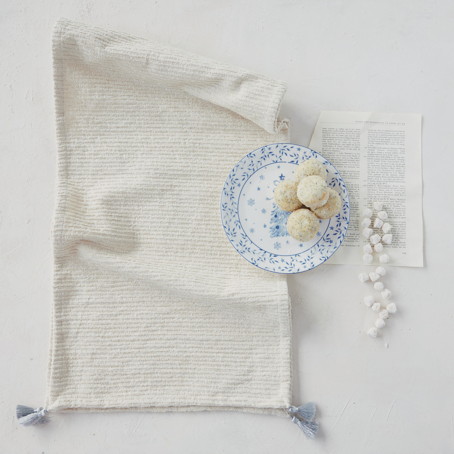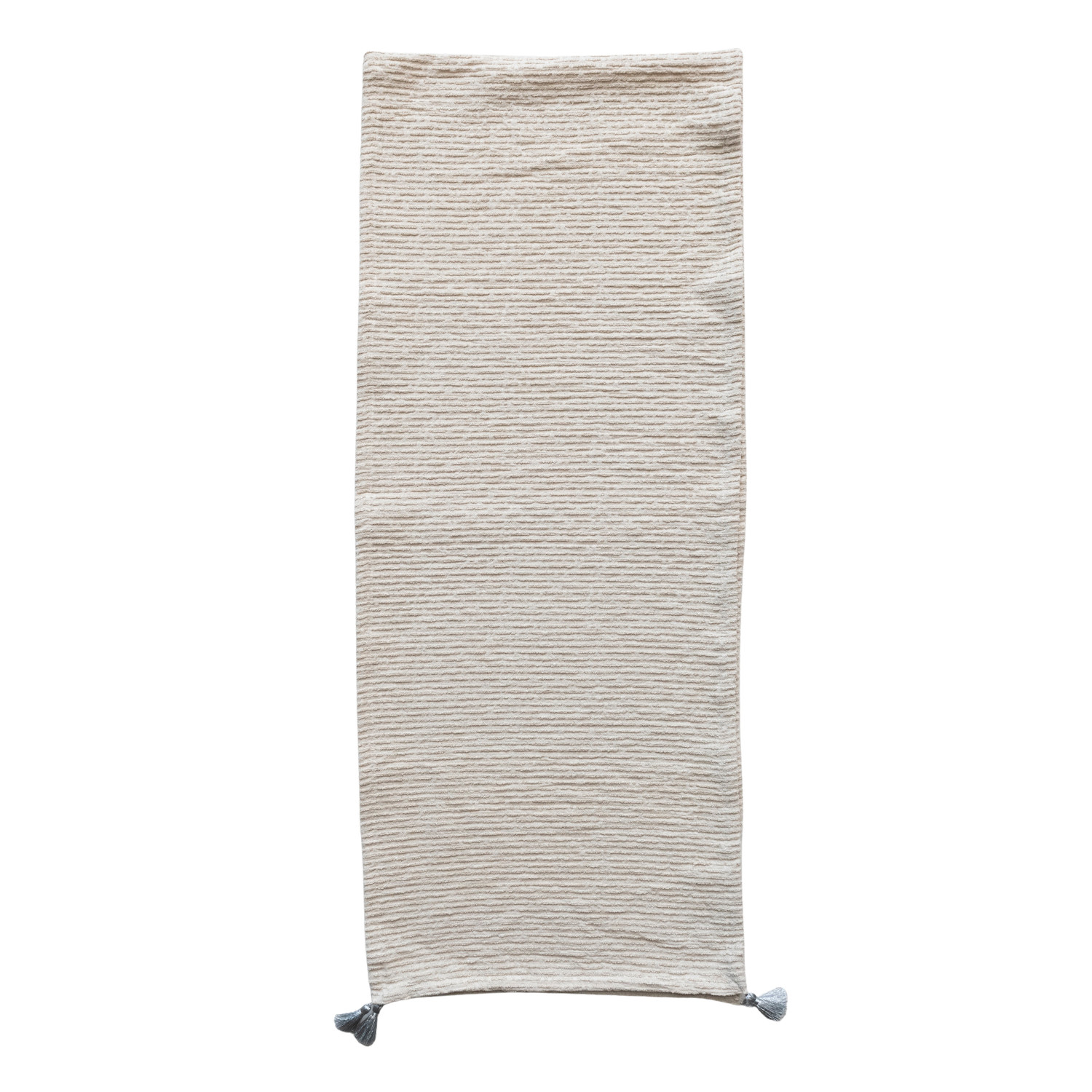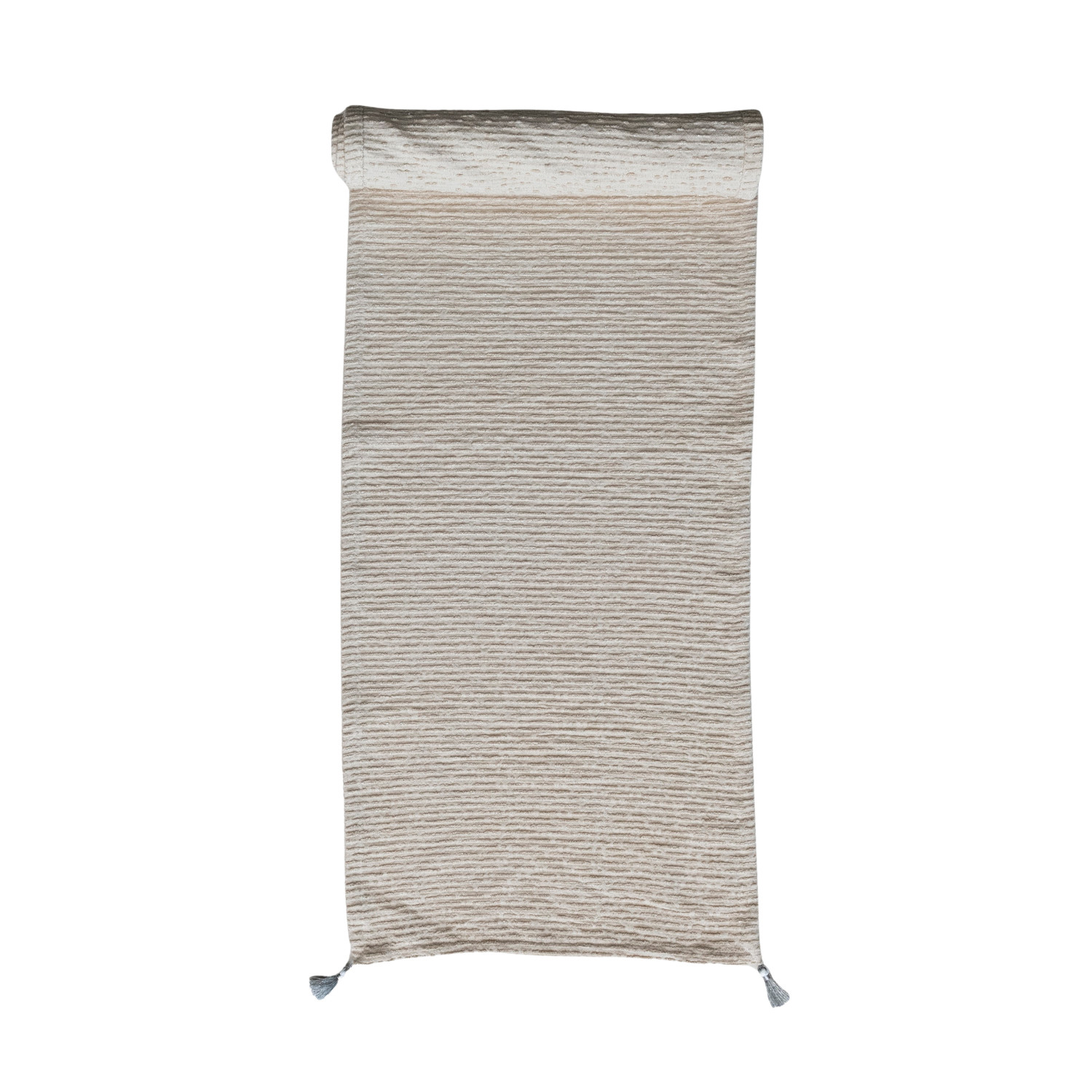 Woven Cotton Table Runner with Metallic Silver Thread Embroidery & Tassels, White & Blue