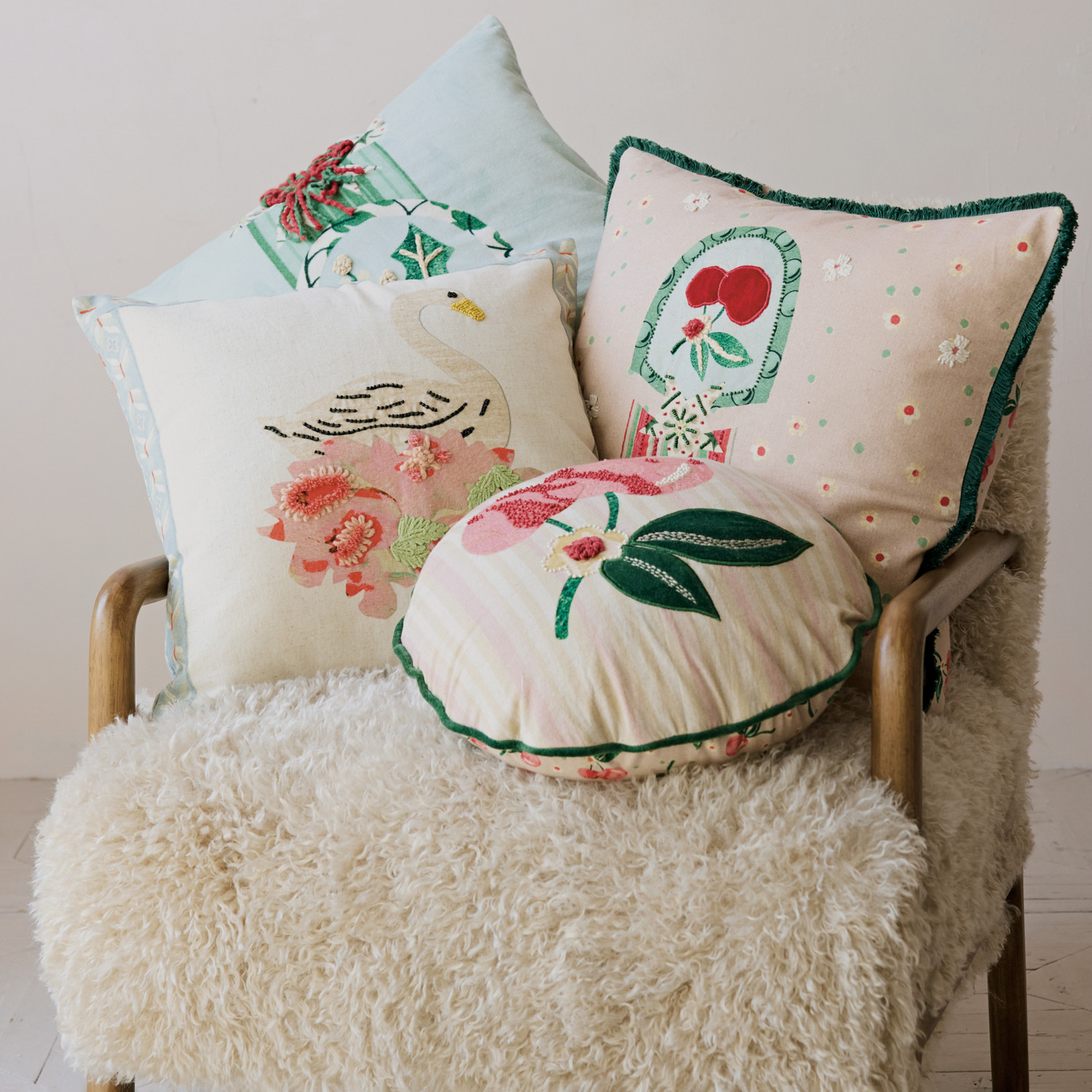 20" Square Cotton & Linen Printed Pillow with Applique, Tufted Fringe & Patterned Back ©