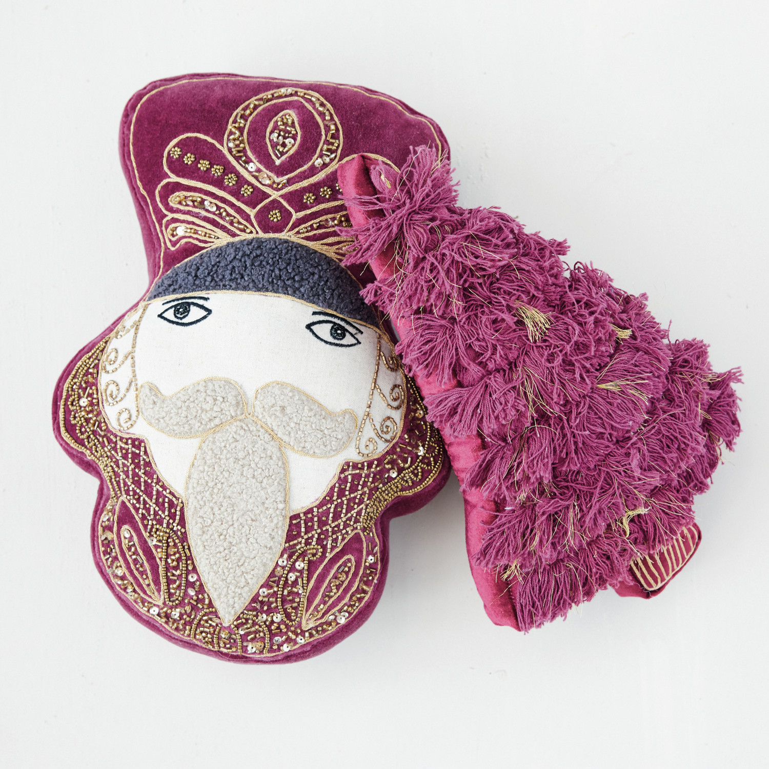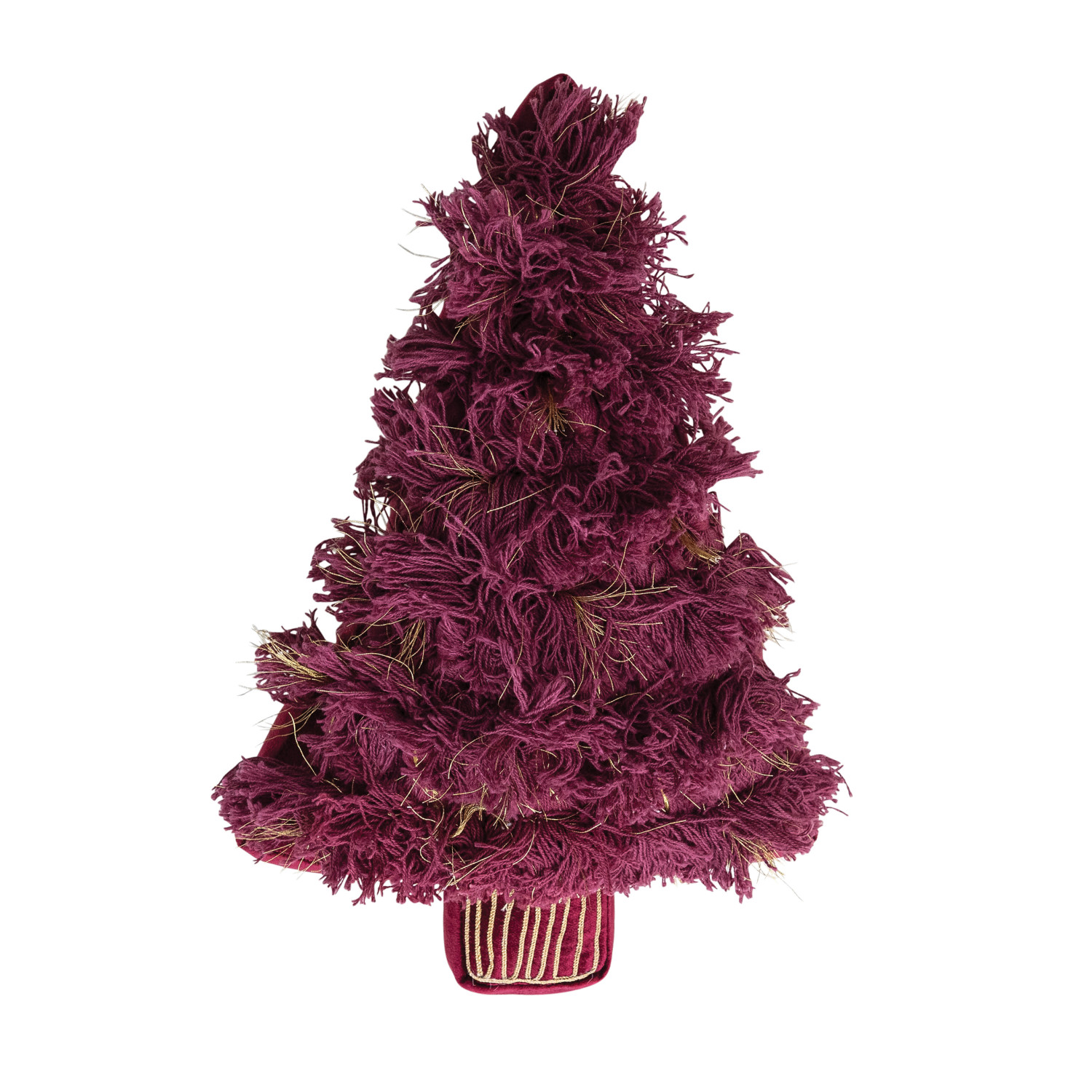 Cotton Velvet Tree Shaped Pillow with Fringe & Metallic Gold Thread Embroidery, Burgundy