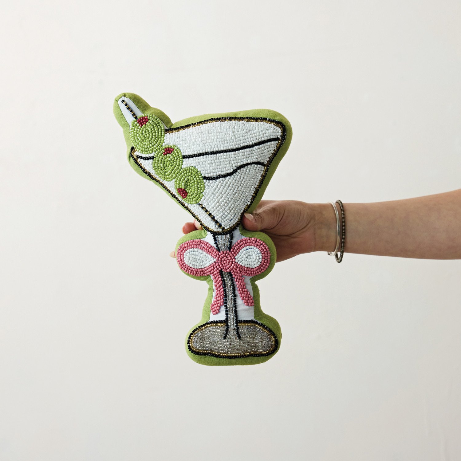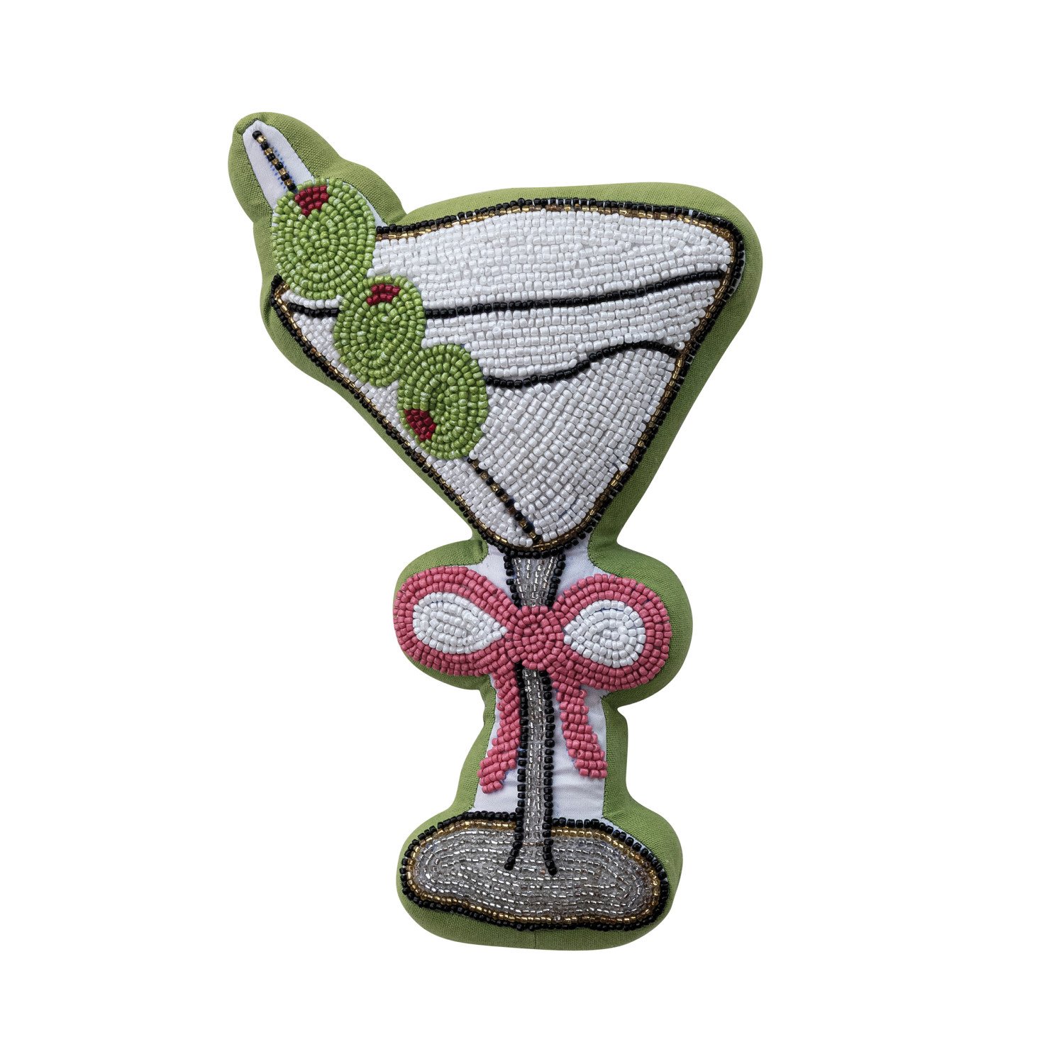 Fabric Beaded Martini Shaped Pillow with Bow & Velvet Back