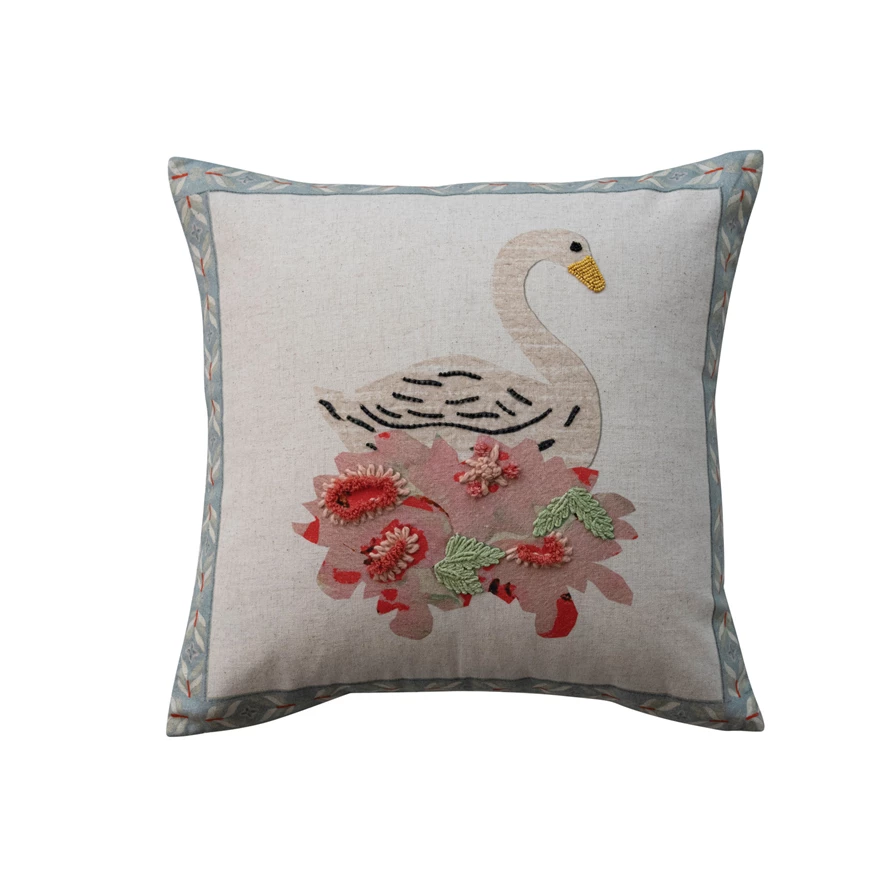 Catalog Name: 18" Square Cotton & Linen Printed Pillow w/ Swan, Flowers, Embroidery, Beads & Striped Patterned Back, Multi Color ©