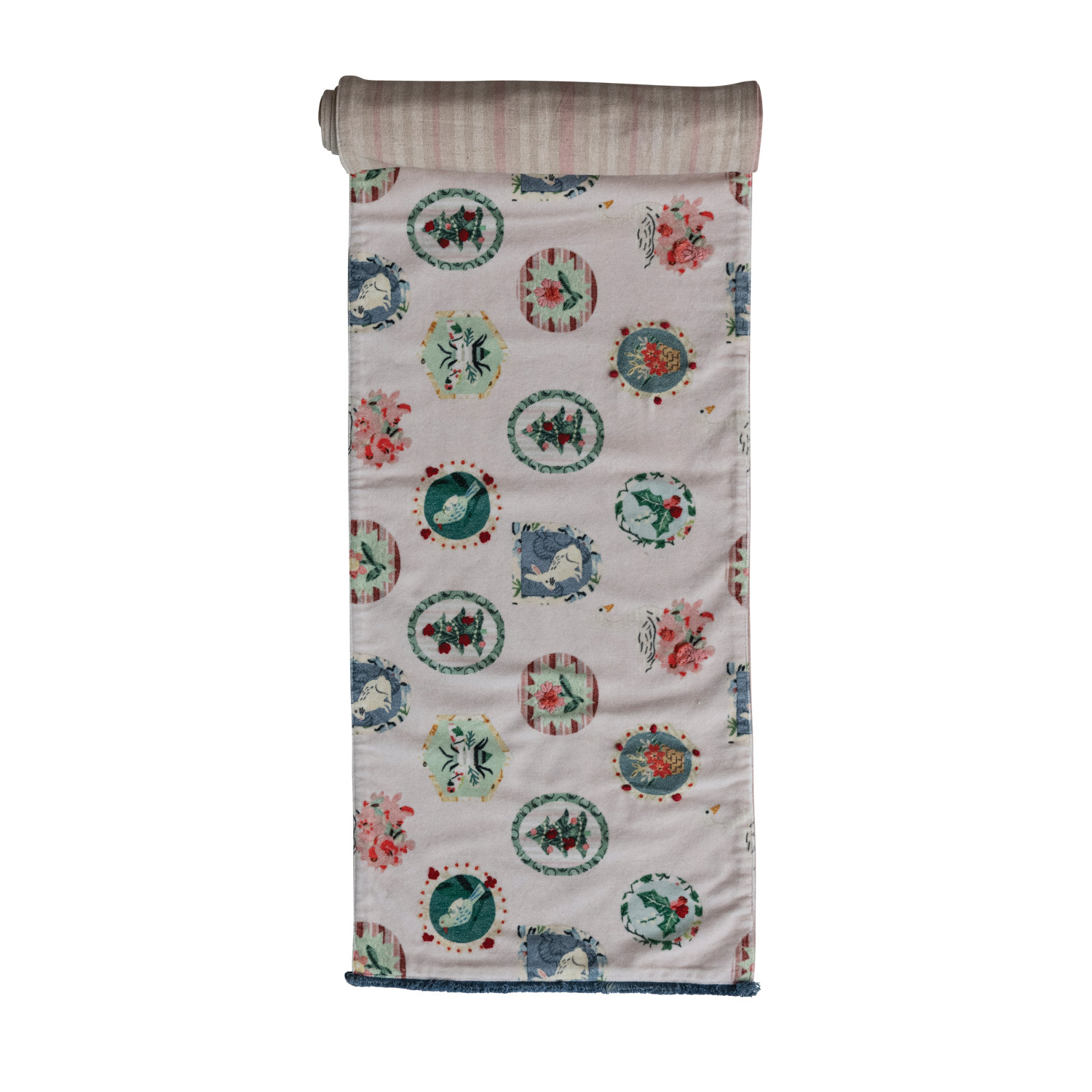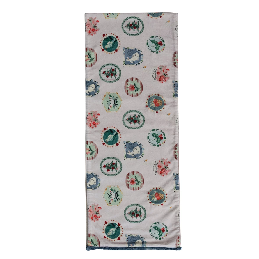 Cotton Velvet Printed Two-Sided Table Runner with Tufted Fringe & Linen Back ©