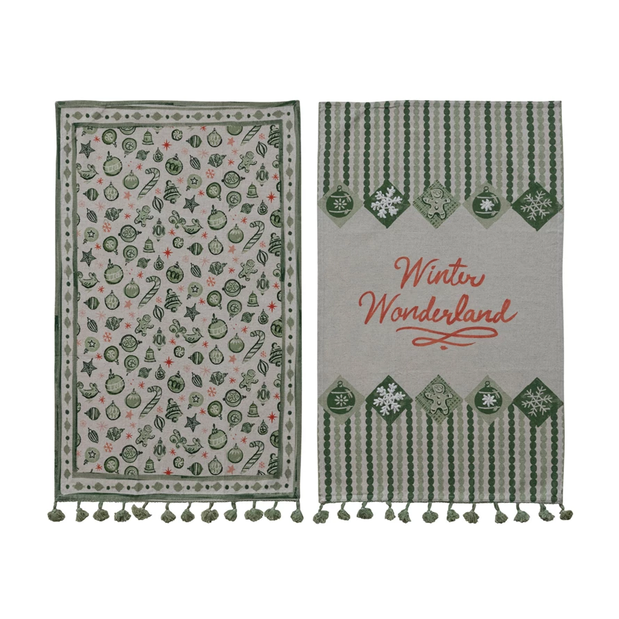 Cotton & Linen Printed Tea Towel with Holiday Pattern/Saying & Tassels, 2 Styles ©