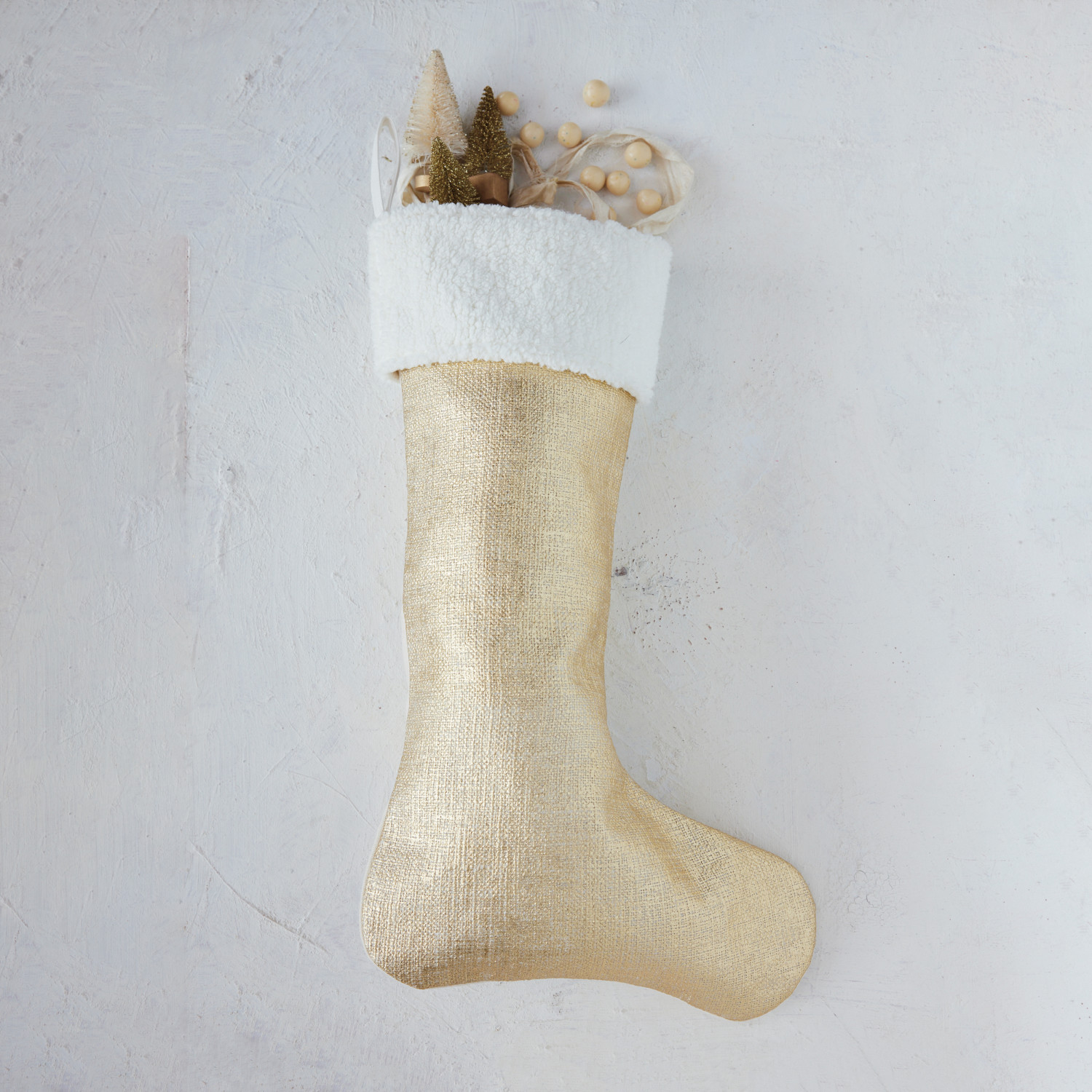 Two-Sided Cotton Slub & Foil Stocking with Faux Sherpa Cuff, White & Gold Color