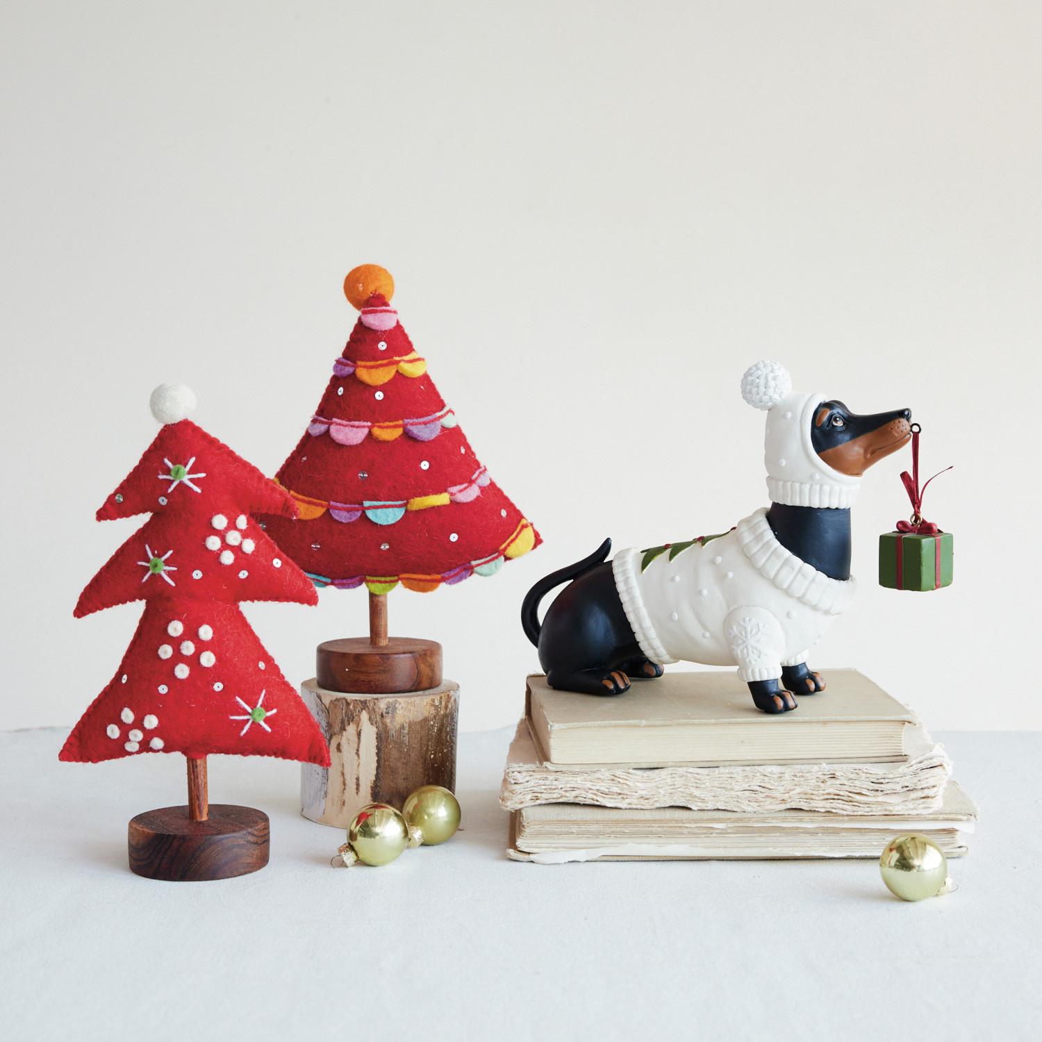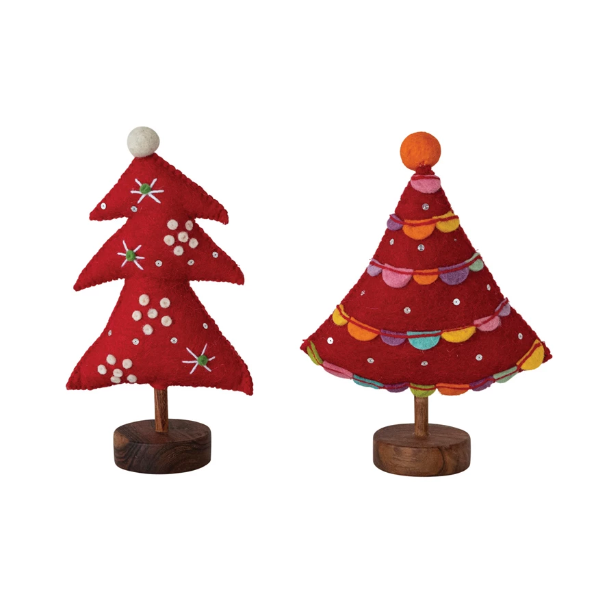 Catalog Name: 10"H - 10-1/2"H Handmade Wool Felt Christmas Tree w/ Embroidery, Sequins, Pom Pom & Wood Base, Multi Color, 2 Styles