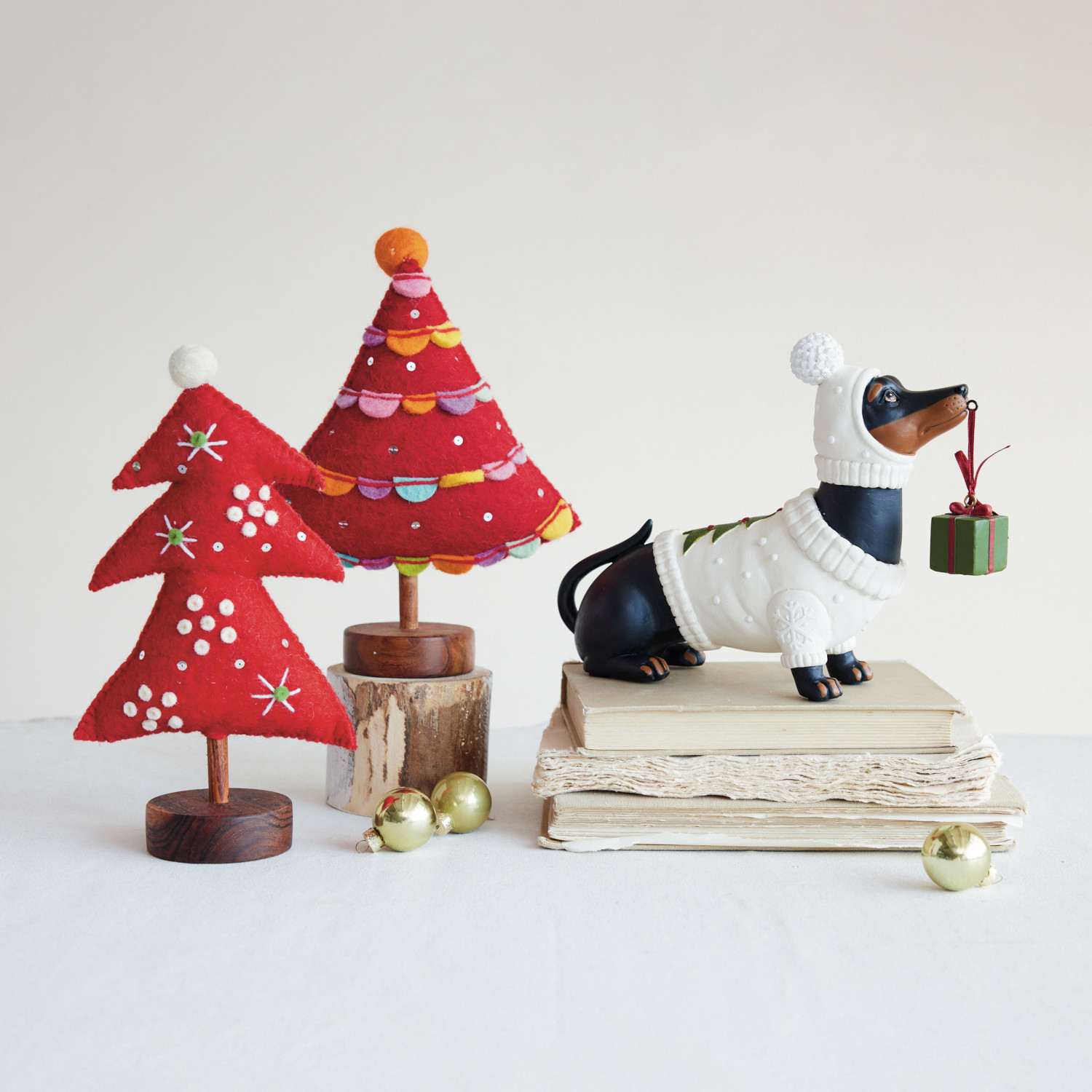 Handmade Wool Felt Christmas Tree with Embroidery, Sequins, Pom Pom & Wood Base, 2 Styles