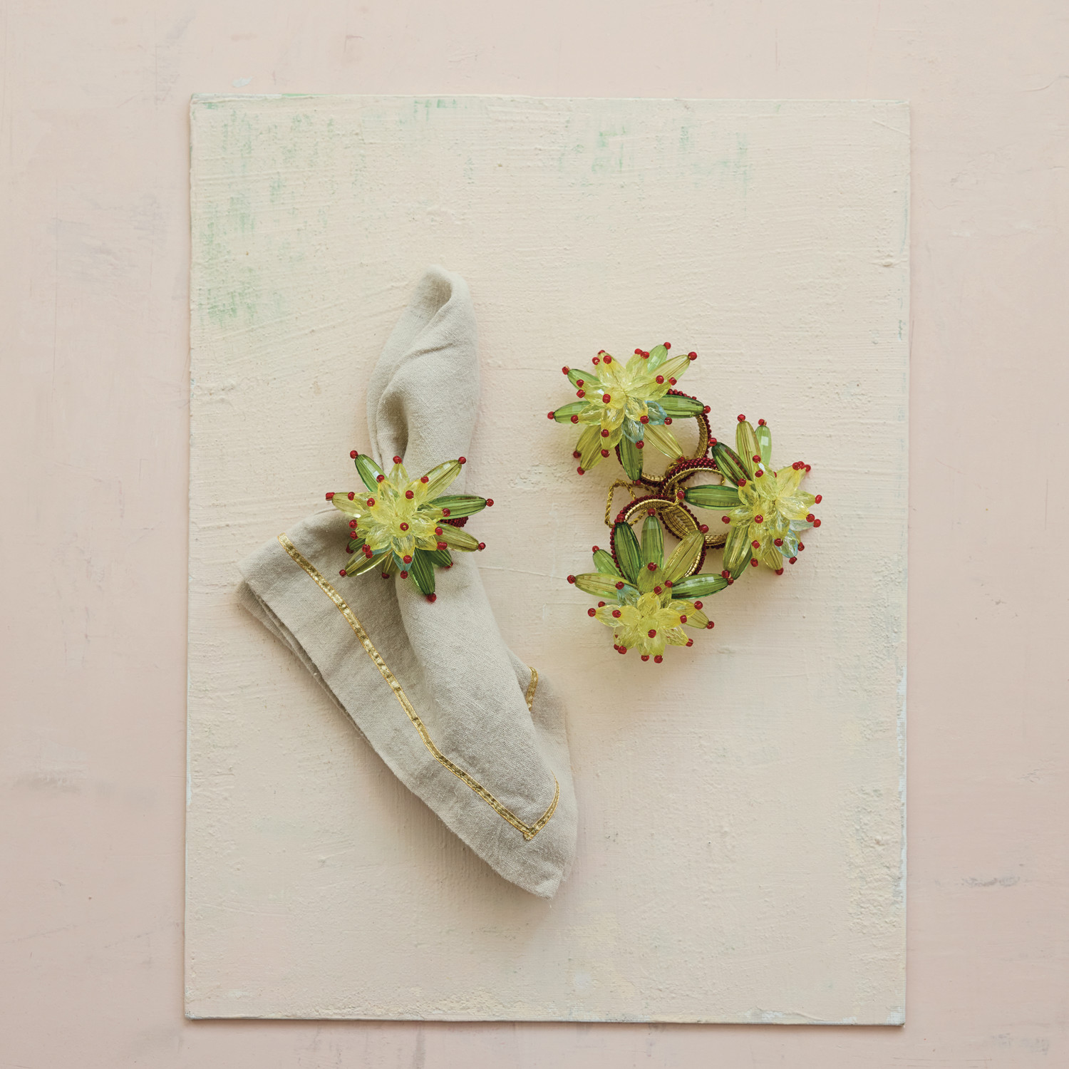 Catalog Name: 2" Round x 3"H Handmade Glass & Acrylic Beaded Metal Flower Napkin Rings, Green & Red, Set of 4 Tied w/ Gold Cord