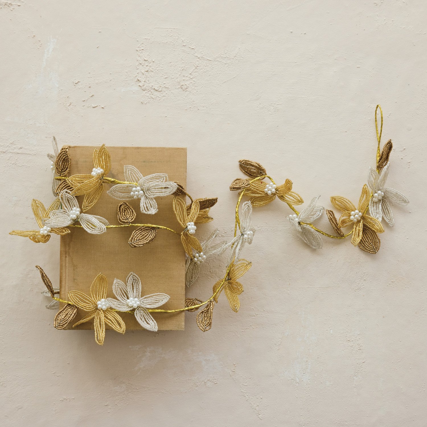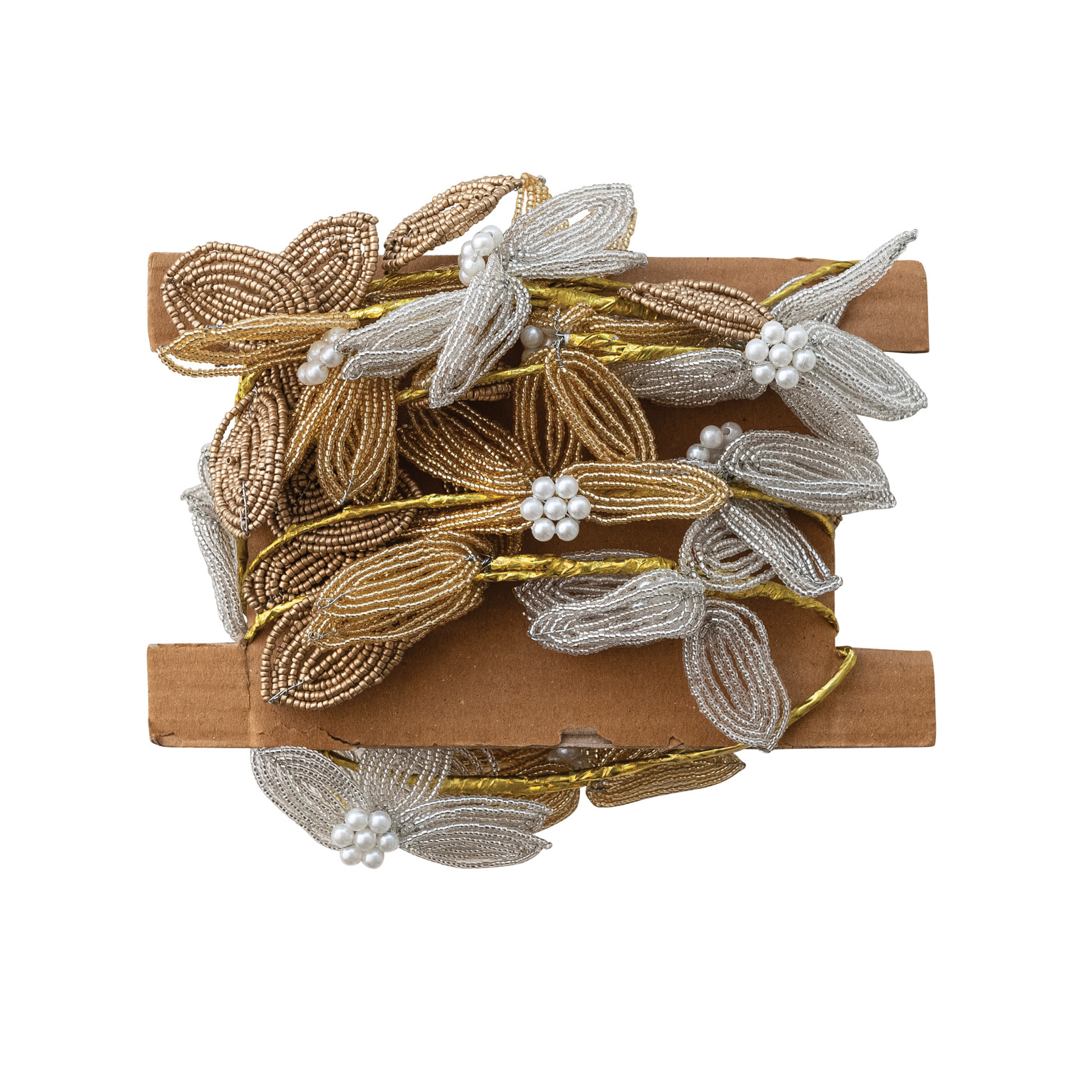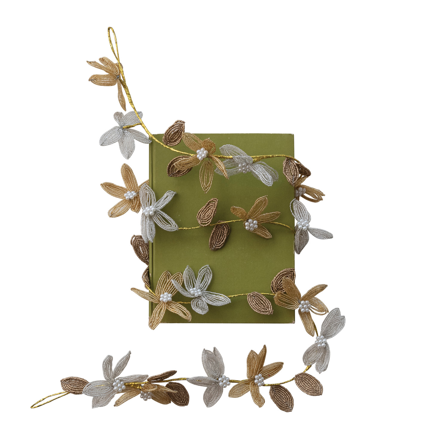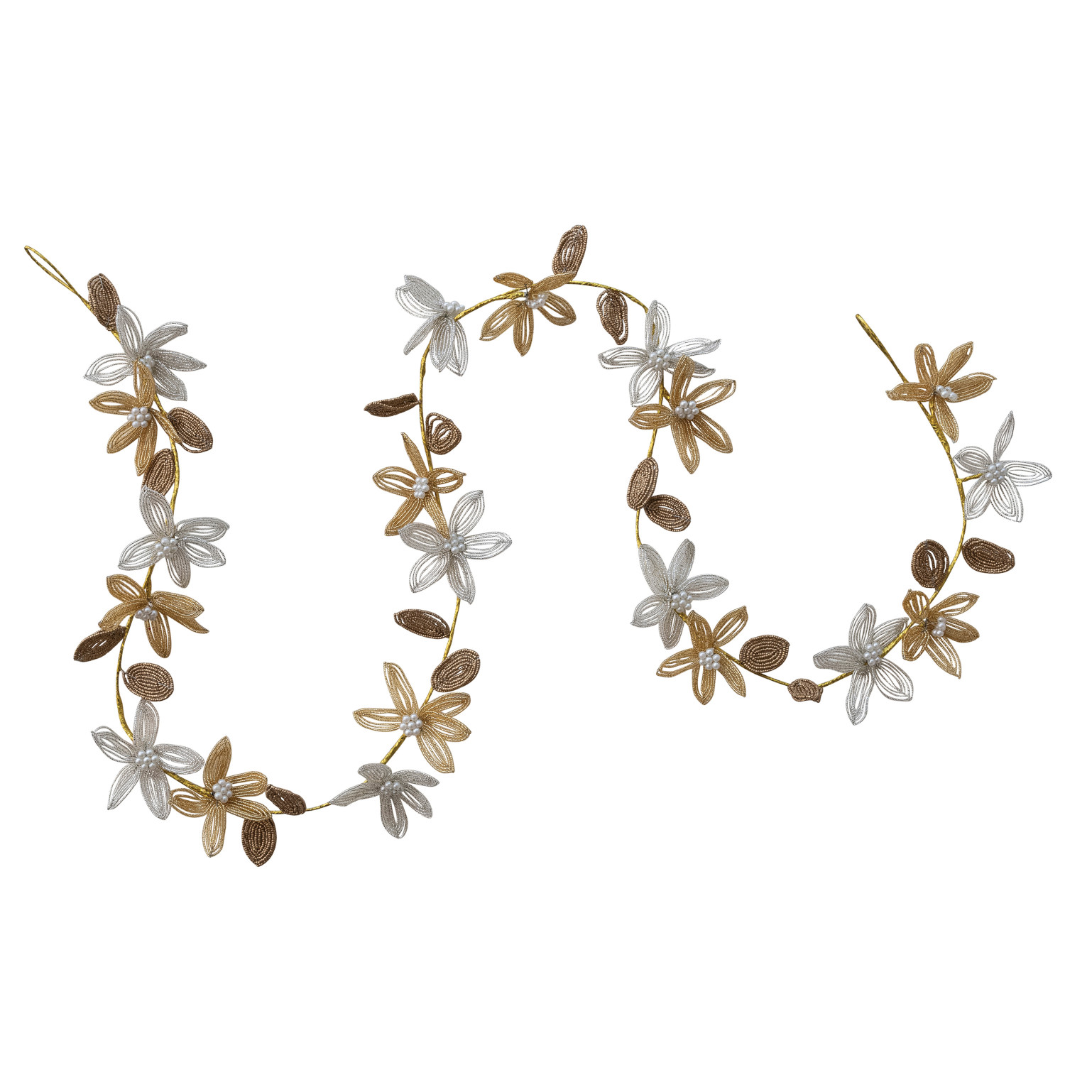Handmade Wire & Glass Beaded Flowers Garland with Faux Pearls, Silver & Gold Finish