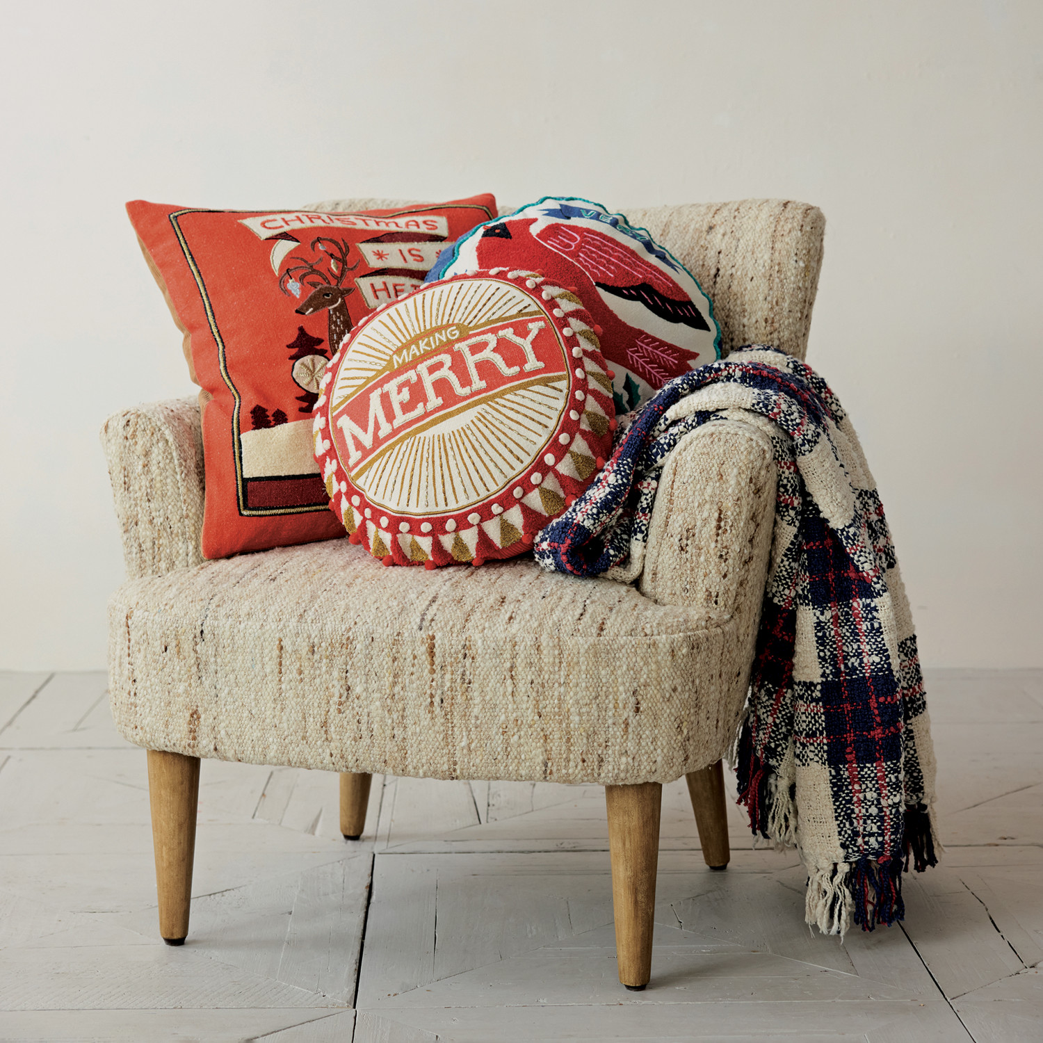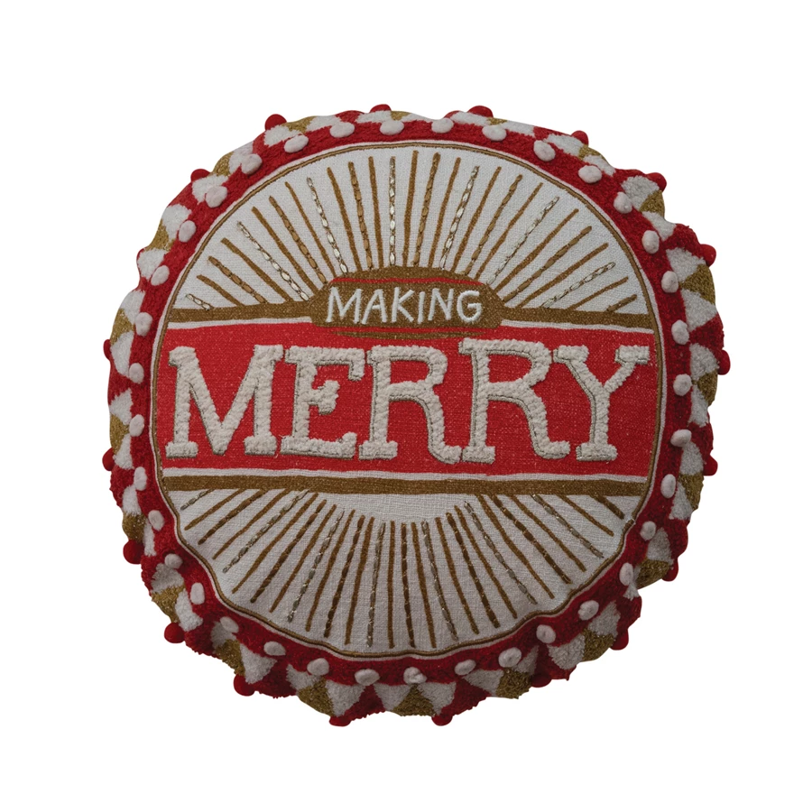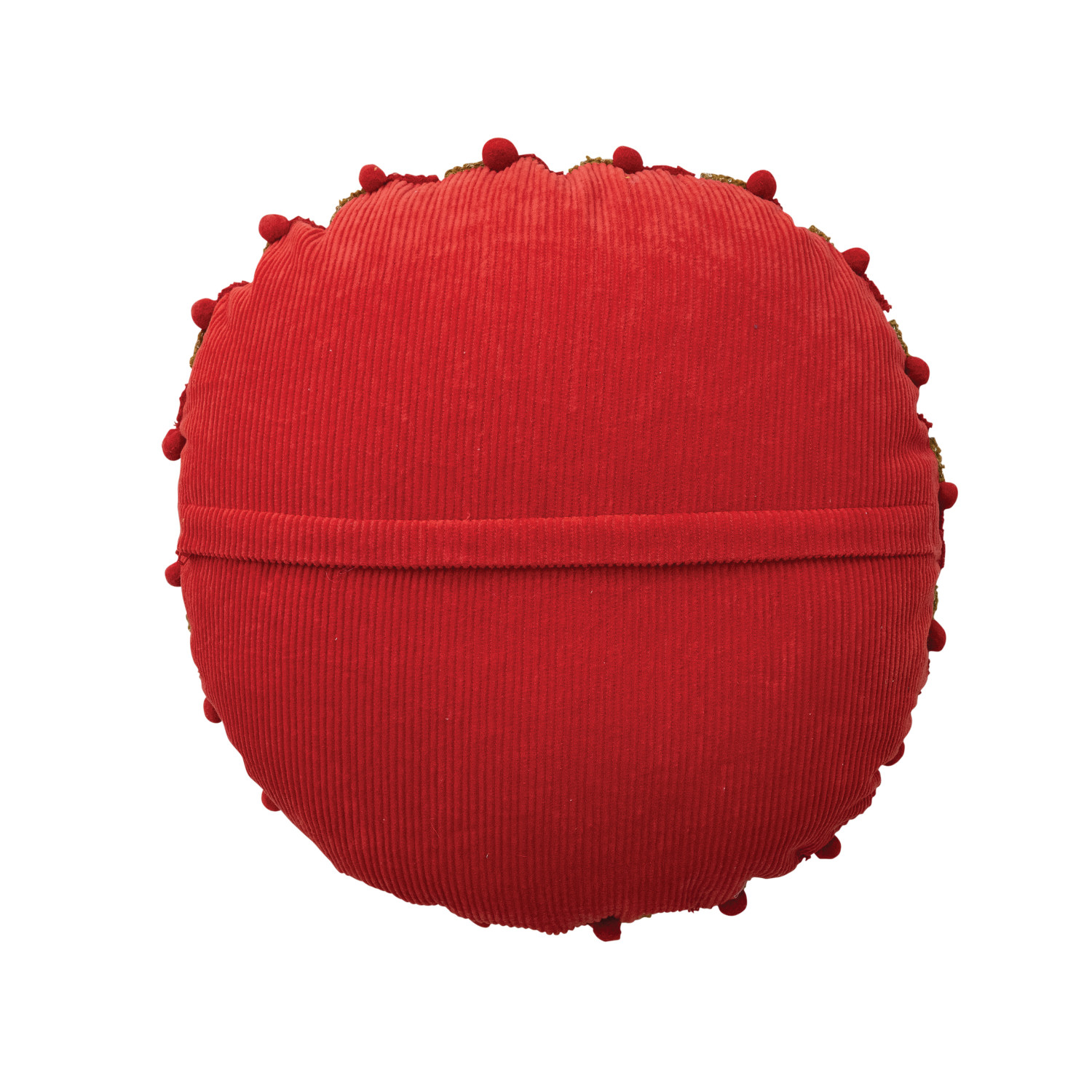 Catalog Name: 16" Round Cotton Slub Printed Pillow w/ Pattern, Embroidery, Pom Pom Trim & Corduroy Back "Making Merry", Multi Color ©