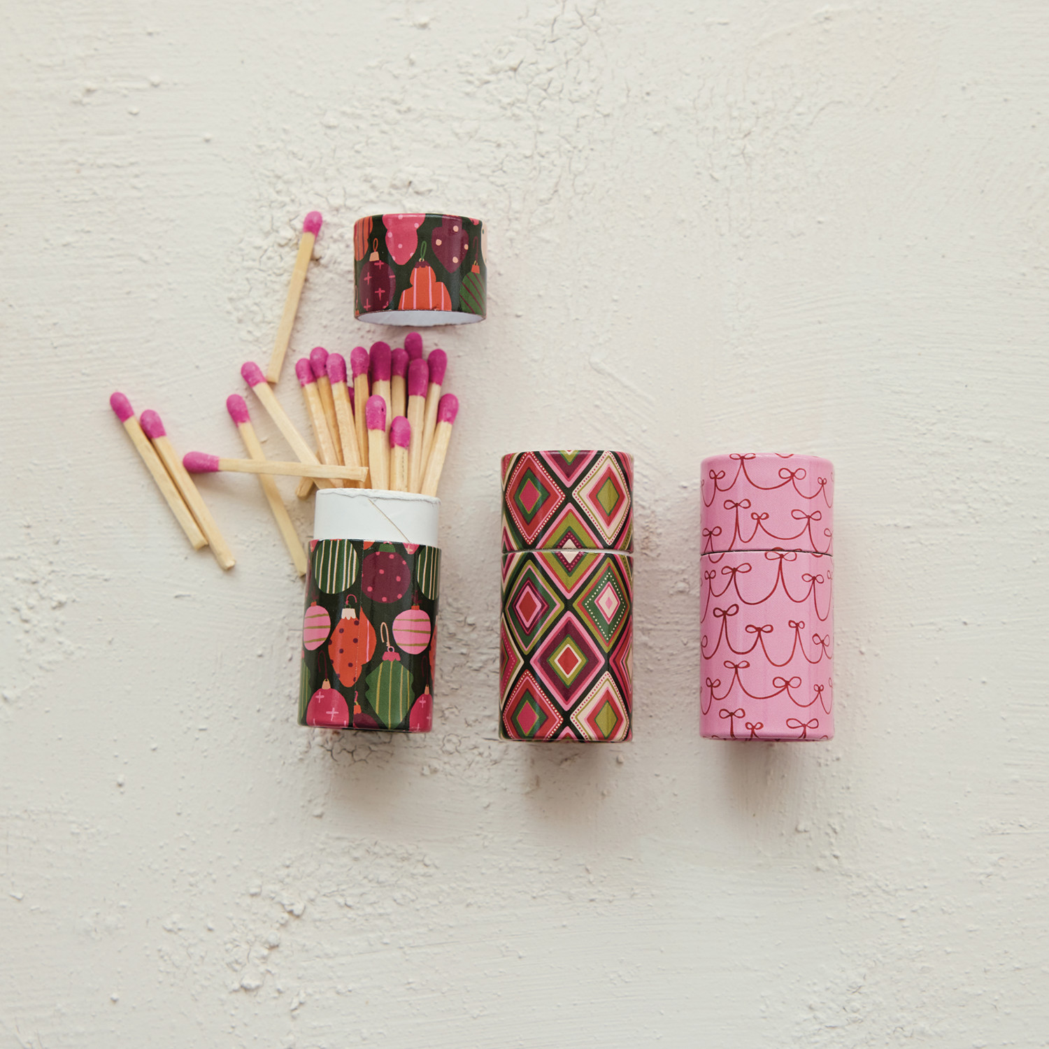 Safety Matches in Tube Matchbox with Holiday Pattern, 3 Styles ©
