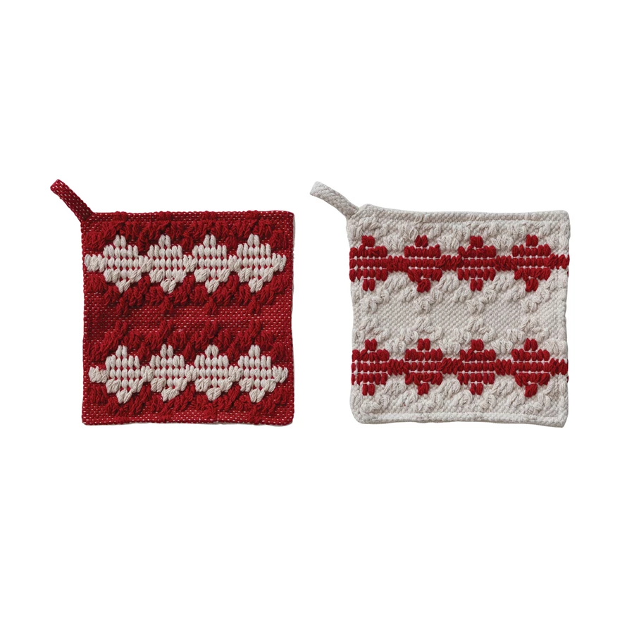 Woven Cotton Tufted Pot Holder with Diamond Pattern & Terry Cloth Back, 2 Colors