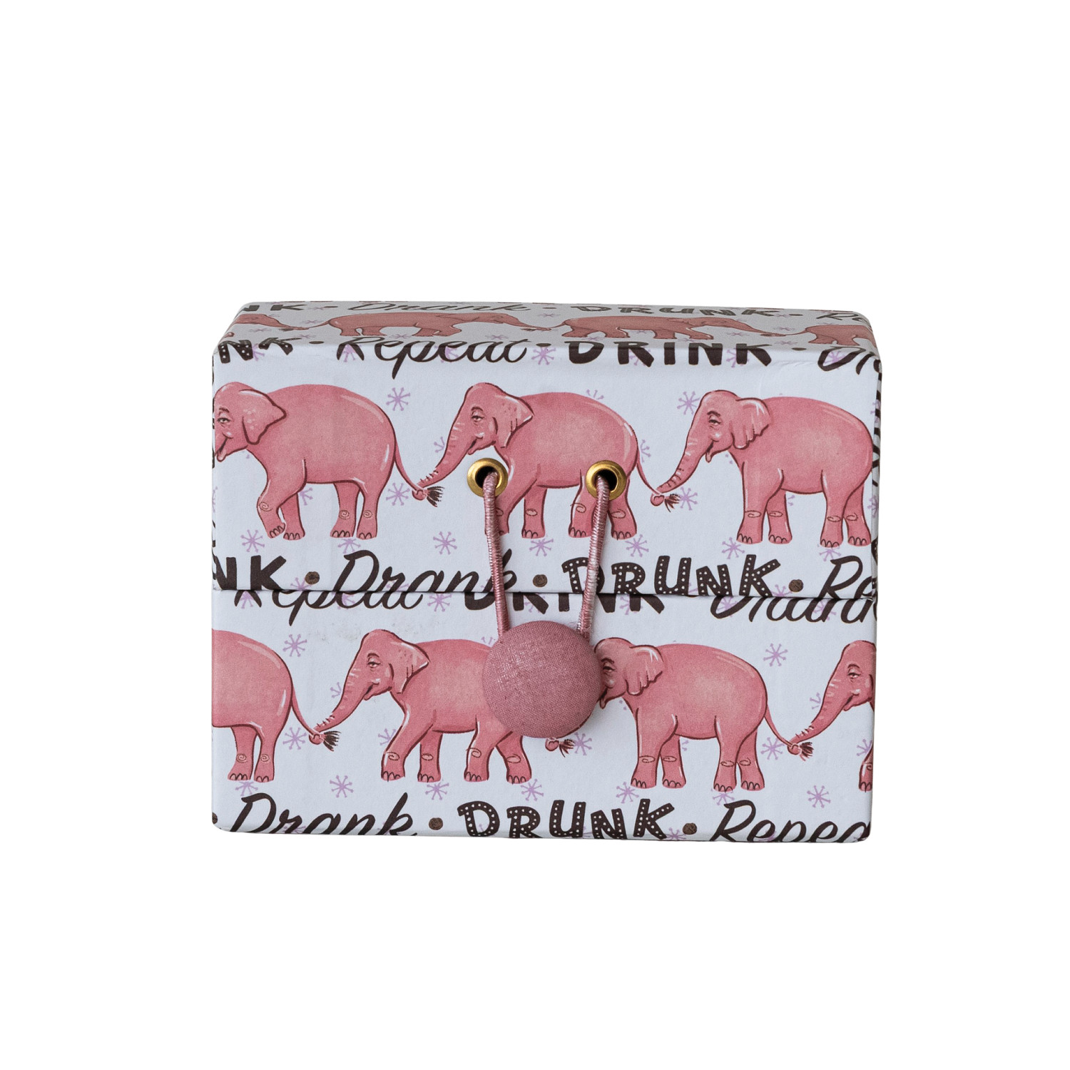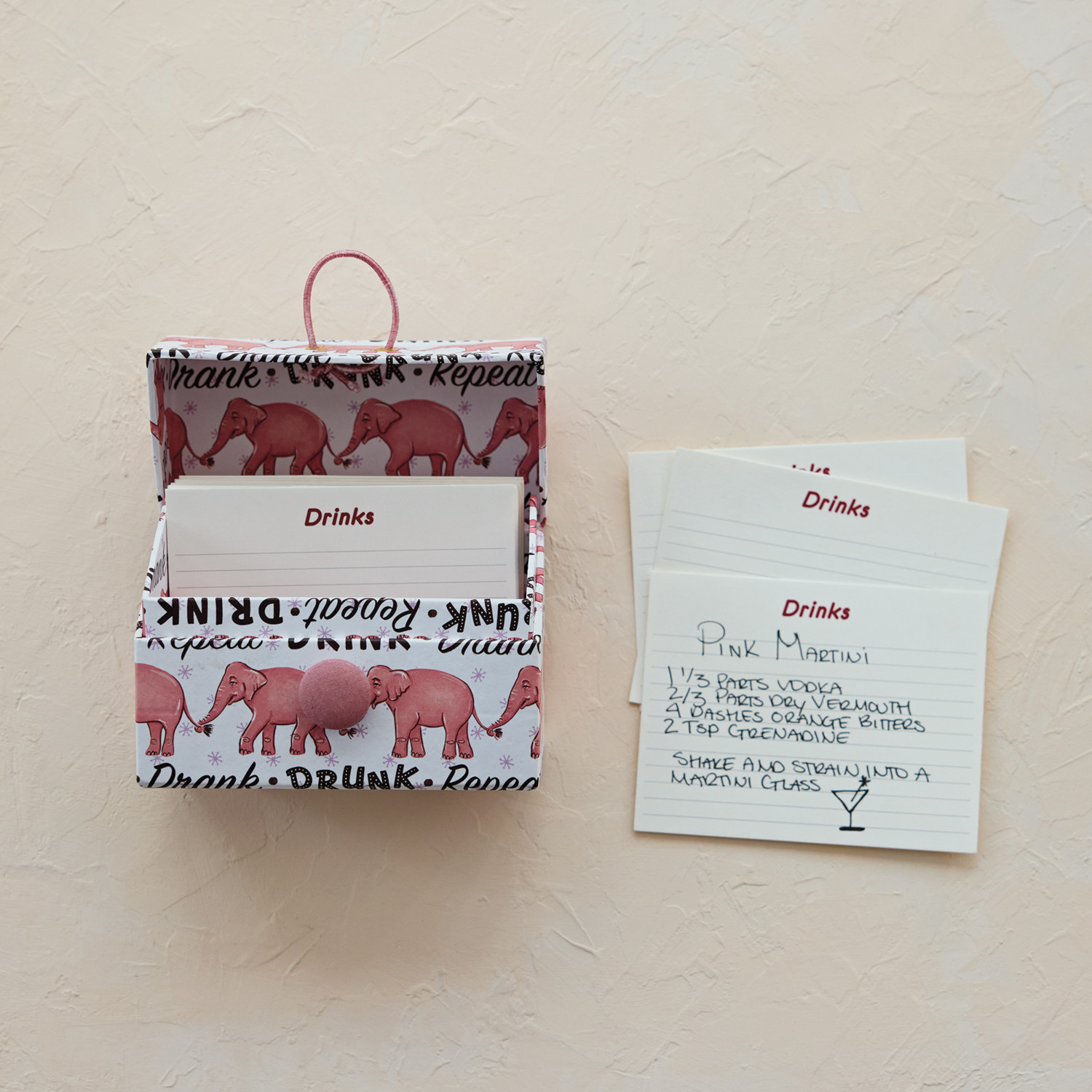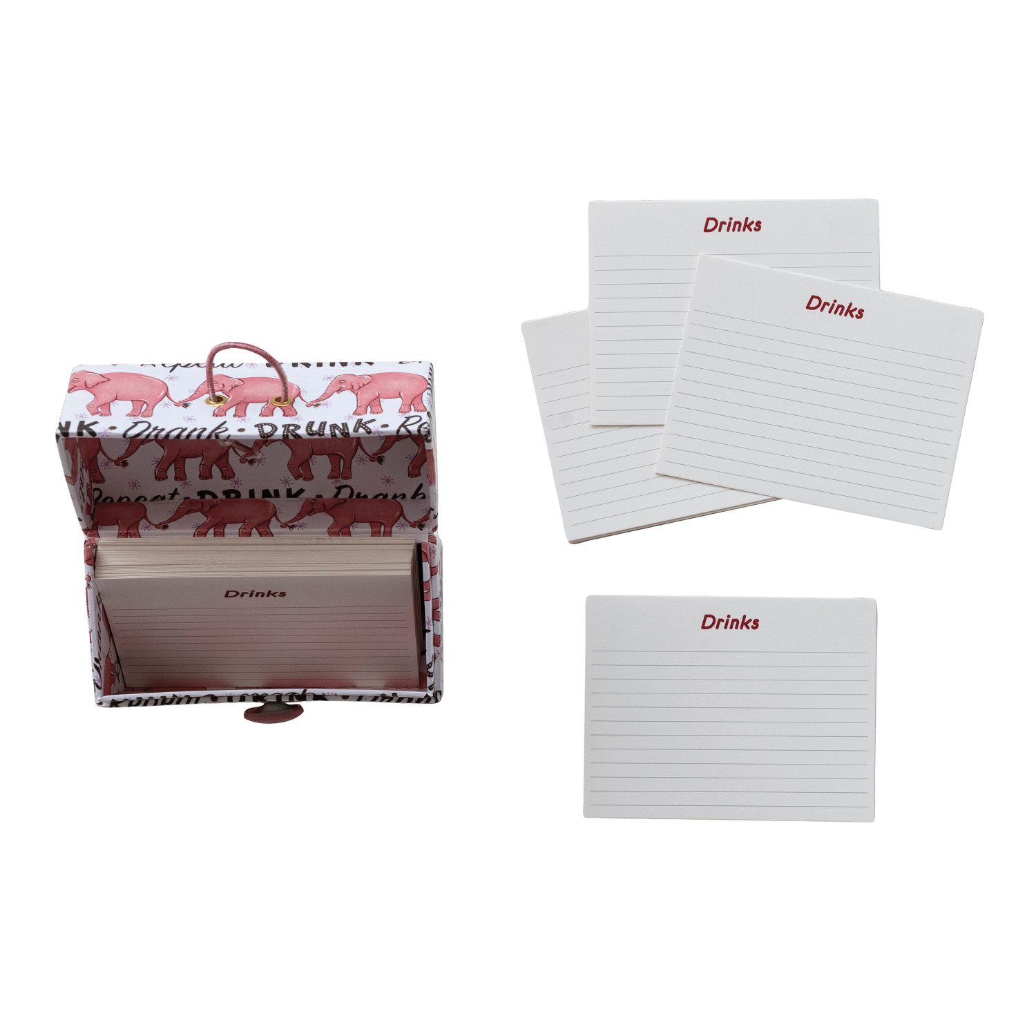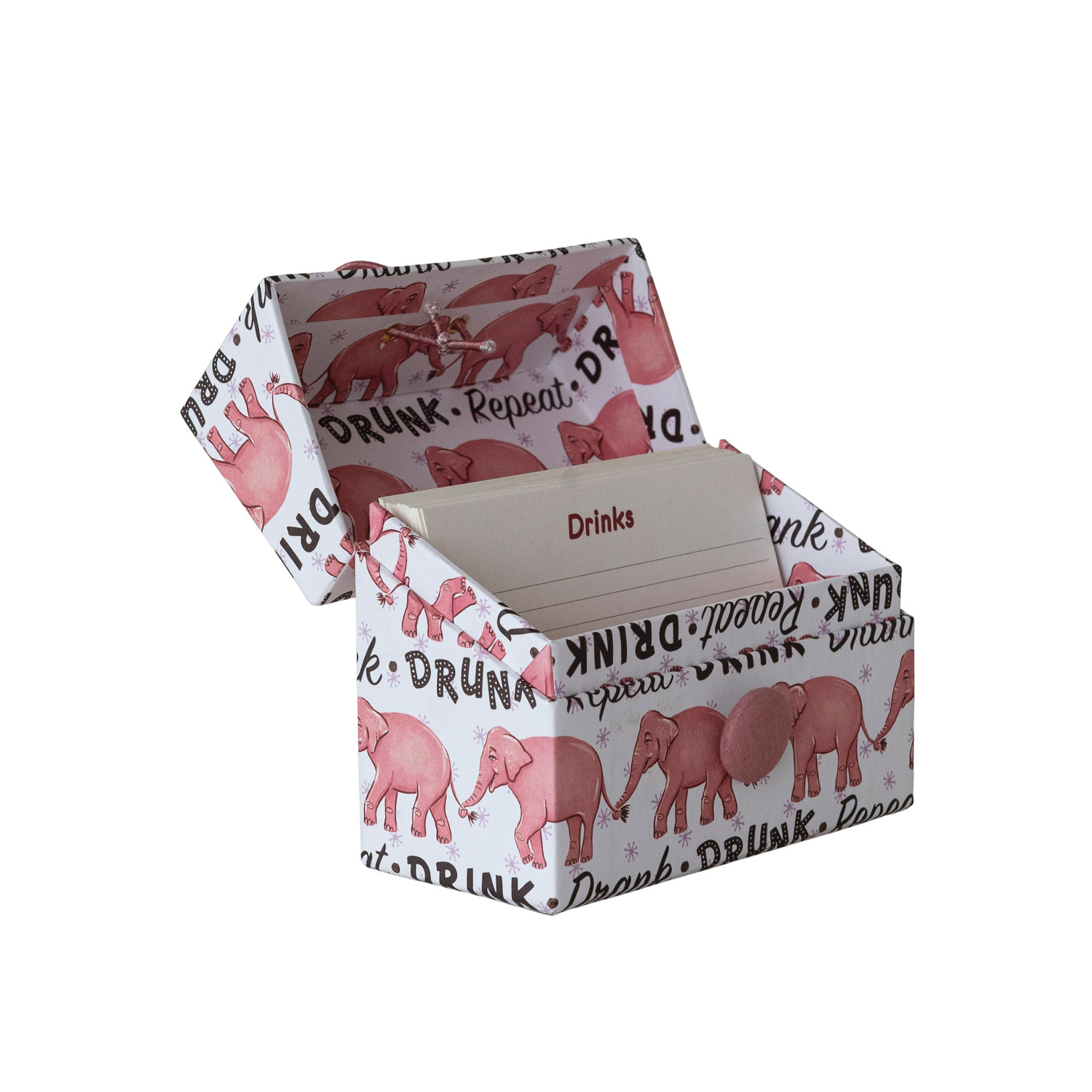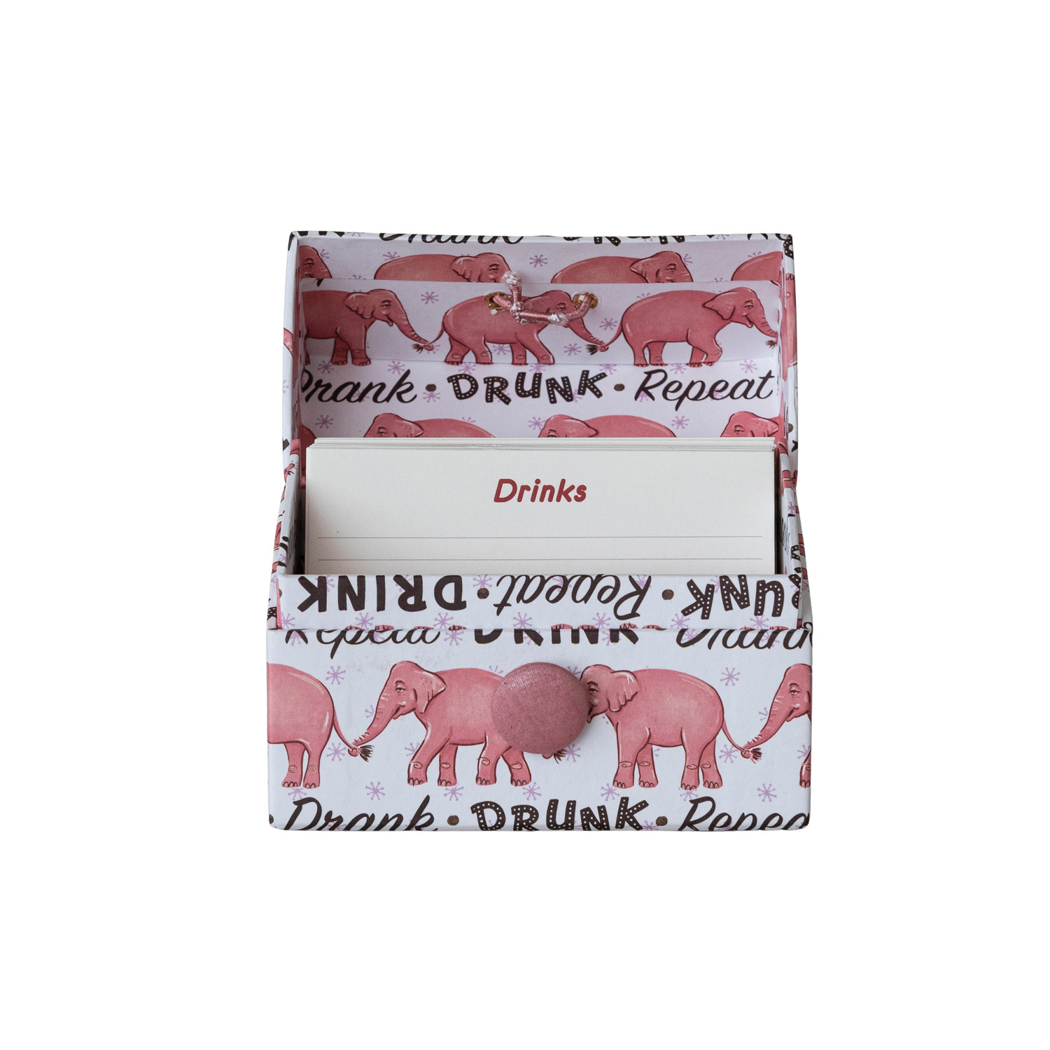 Catalog Name: 5-1/2"L x 2-3/4"W x 4"H Handmade Printed Recycled Paper Recipe Box w/ 36 Recipe Cards, Pink Elephants Pattern & Pink Button Closure, Multi Color, Set of 37 ©