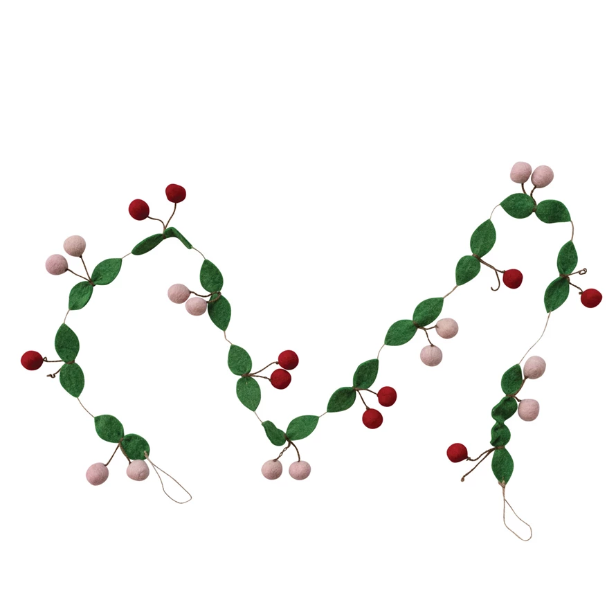 Catalog Name: 72"L x 3"H Handmade Wool Felt Cherries Garland w/ Jute Cord, Green, Pink & Red