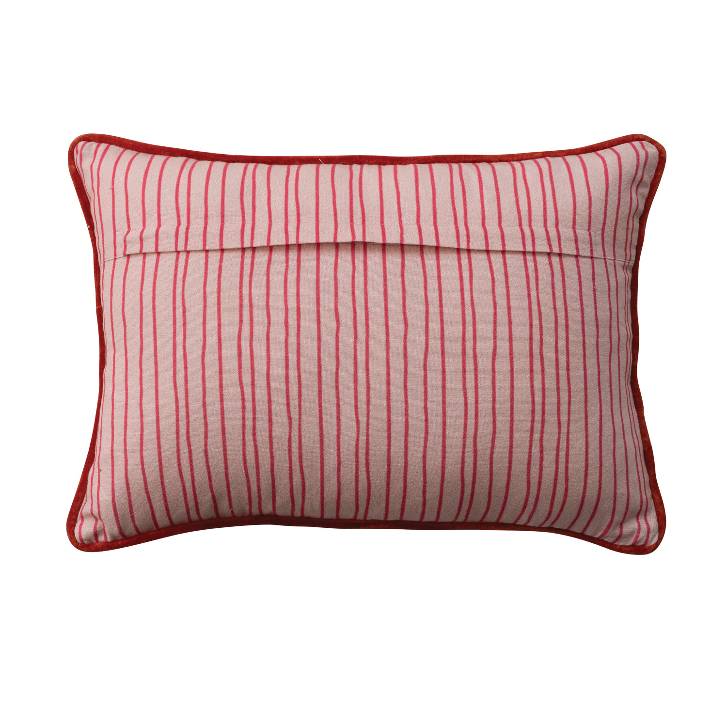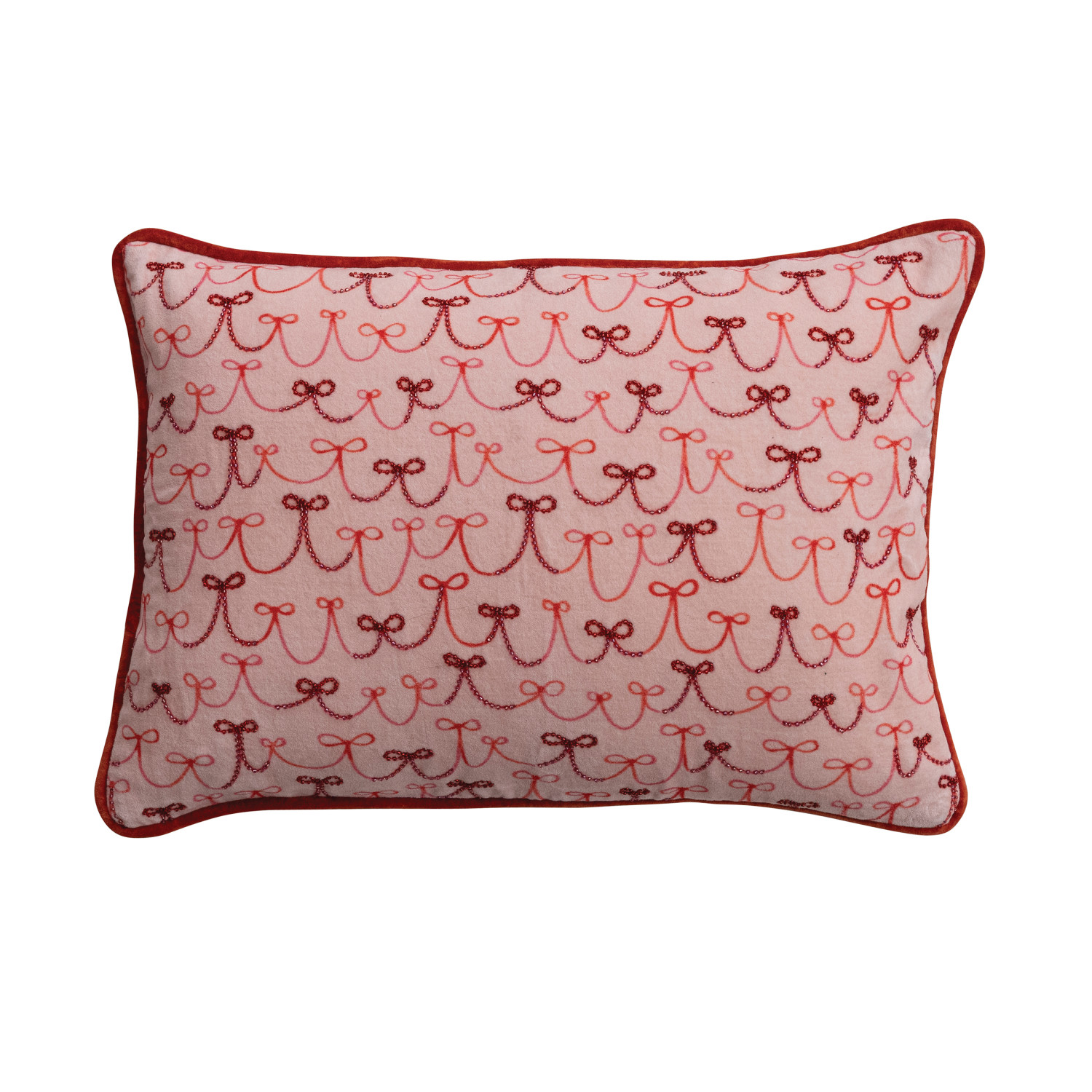 Catalog Name: 20"L x 14"H Cotton Velvet Printed Lumbar Pillow w/ Bow Pattern, Piping, Beads & Striped Back, Cream Color, Red & Pink ©