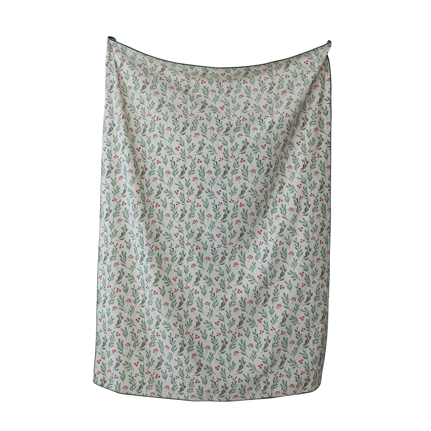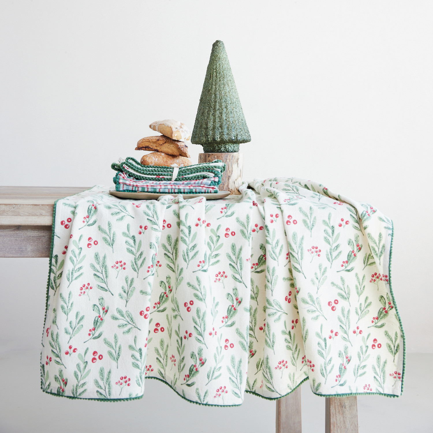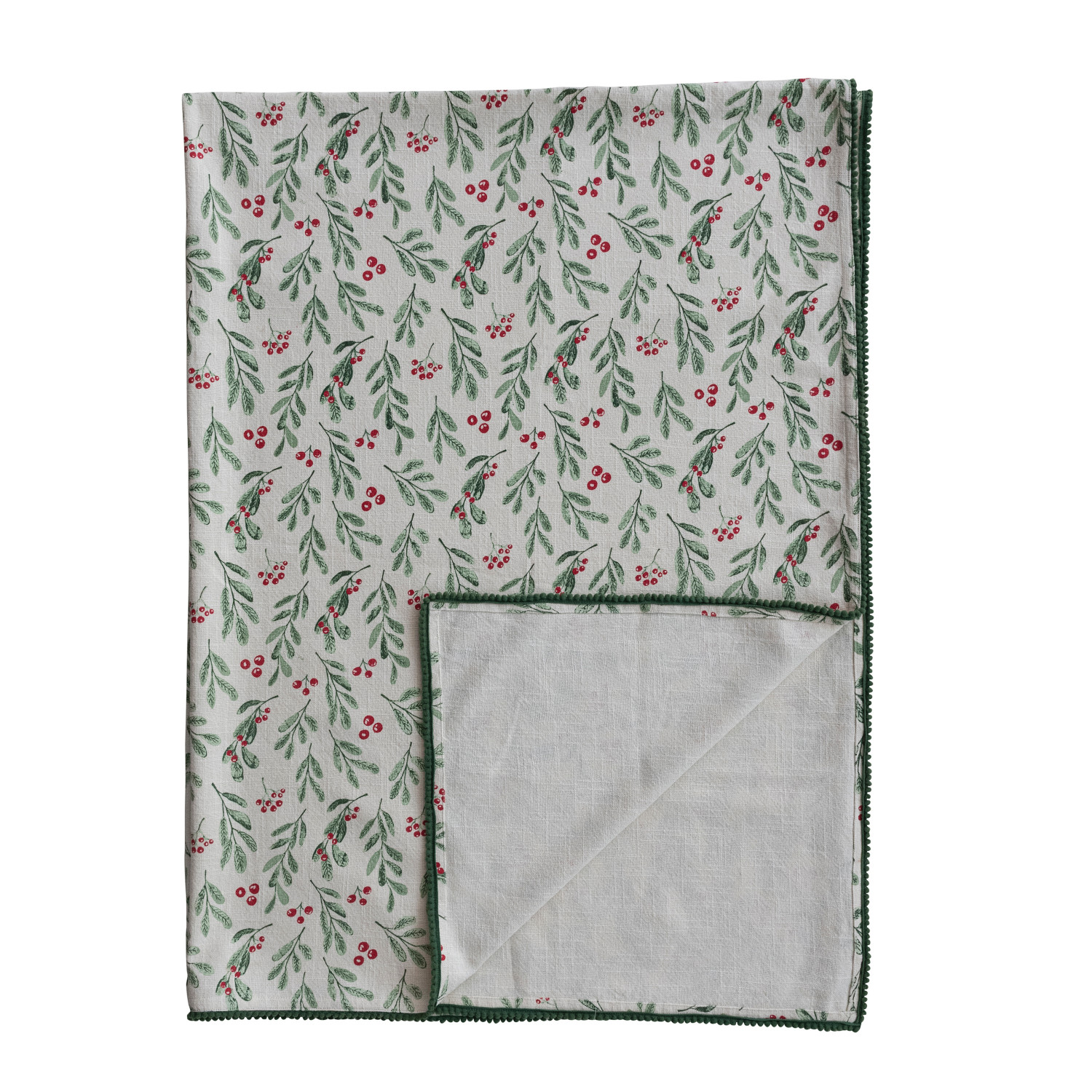 84"L x 60"W Cotton Printed Table Cloth with Mistletoe Pattern & Mini Pom Pom Trim