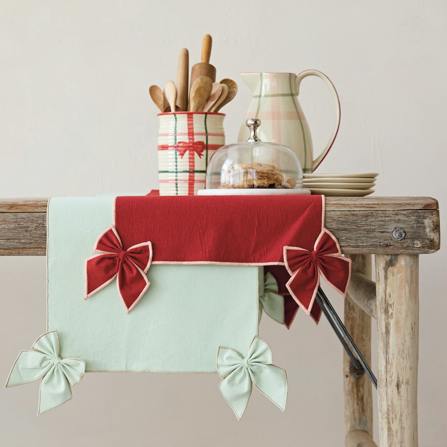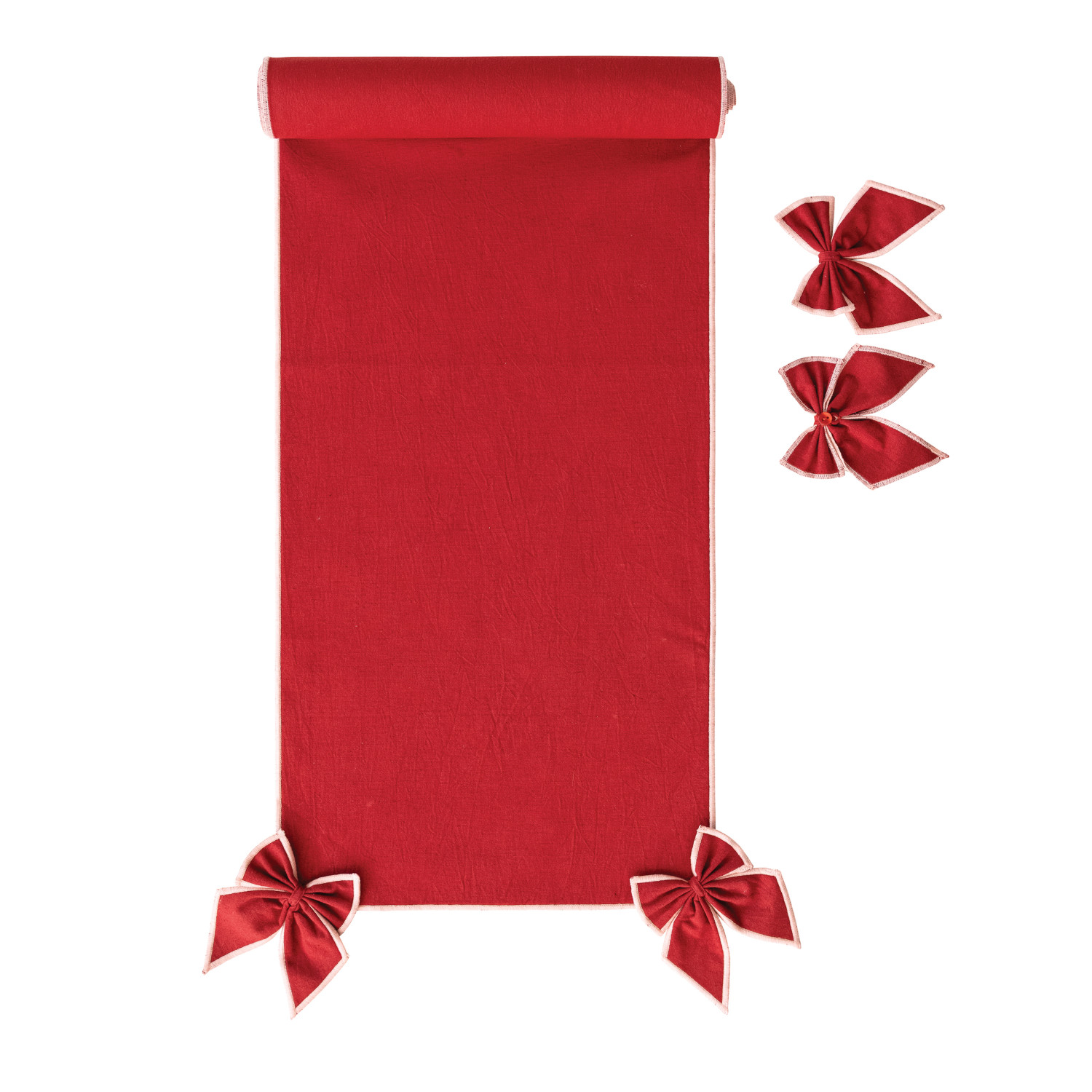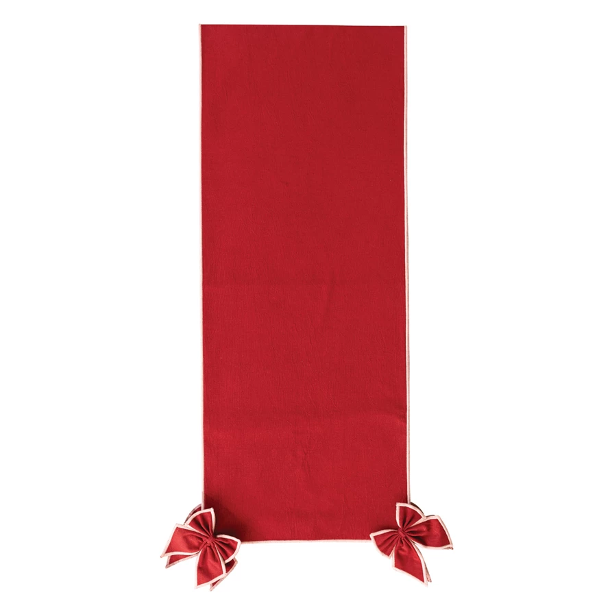 Cotton & Linen Table Runner with Detachable Bows & Pink Stitched Edge, Red