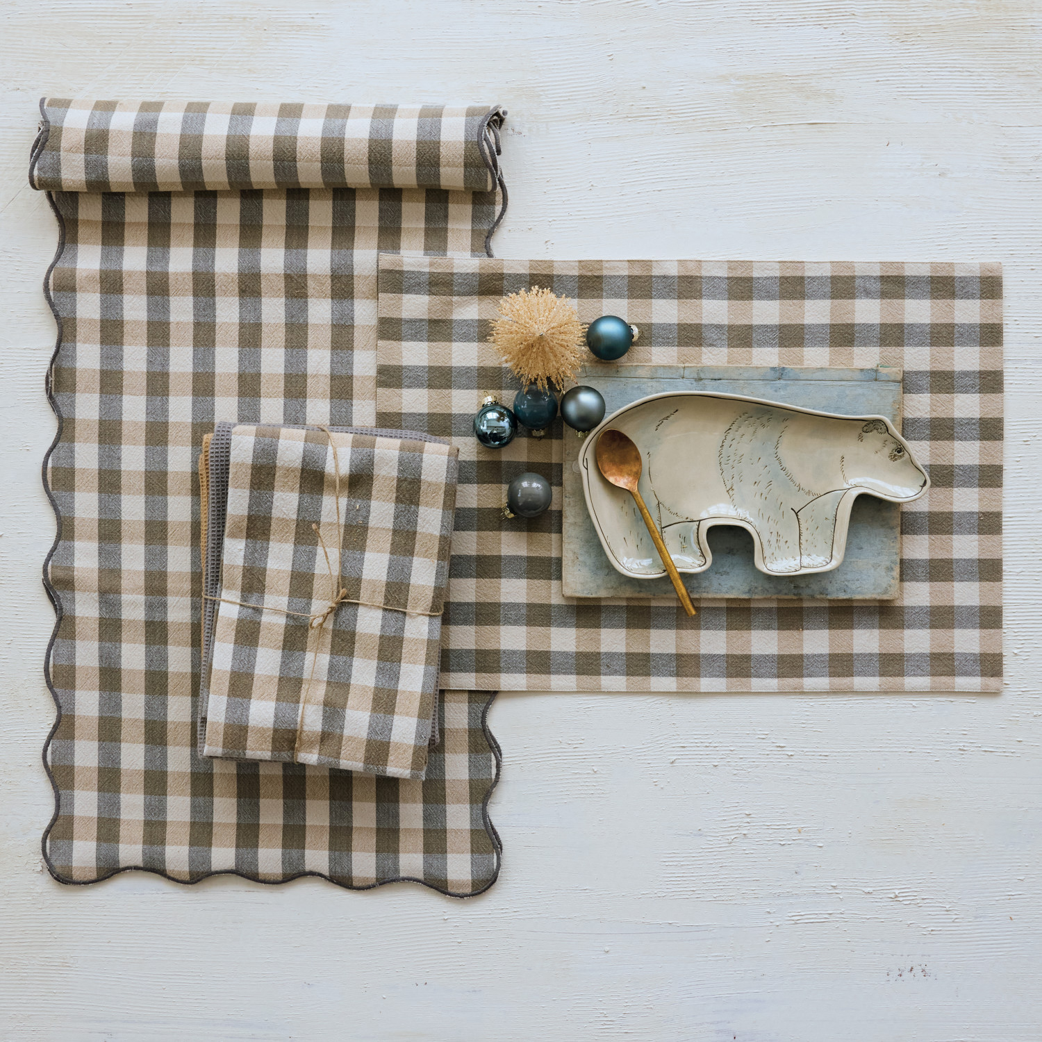 Cotton Scalloped Table Runner with Check Pattern & Stitched Edge, Roll Tied with Jute